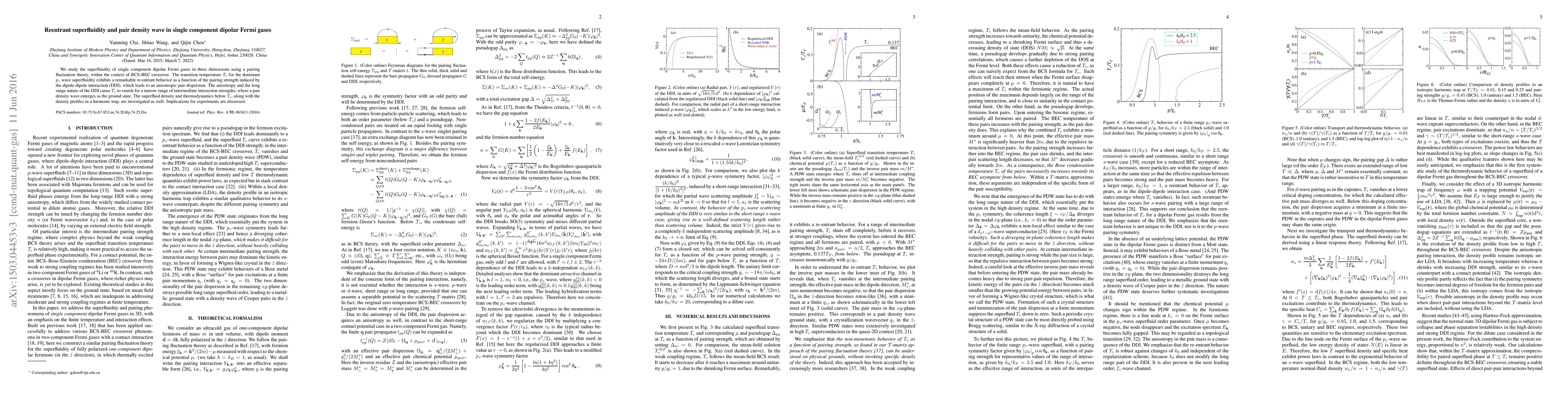 This paper investigates the superfluid properties of three-dimensional dipolar Fermi gases, revealing a re-entrant transition temperature $T_{c}$ influenced by dipole-dipole interactions, leading to a pair density wave state at intermediate interaction strengths. The study also examines the superfluid density and thermodynamic behavior across the BCS-BEC crossover.