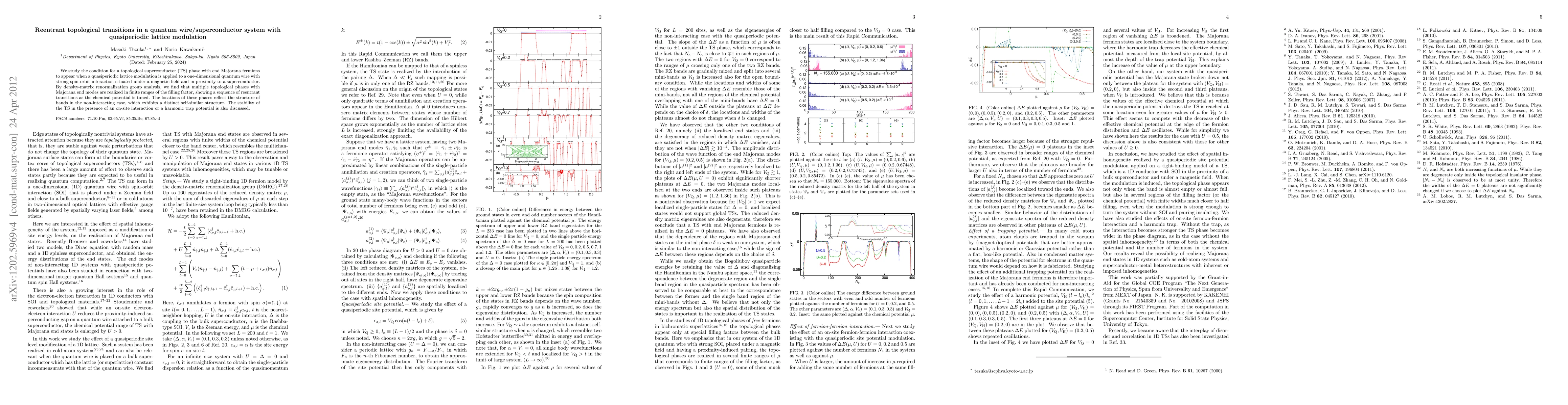 This paper investigates the emergence of topological superconductor phases with Majorana fermions in a quantum wire under quasiperiodic lattice modulation, strong spin-orbit interaction, and proximity to a superconductor. Through density-matrix renormalization group analysis, it reveals multiple topological phases and reentrant transitions influenced by the chemical potential, and discusses the stability of these phases under various perturbations.