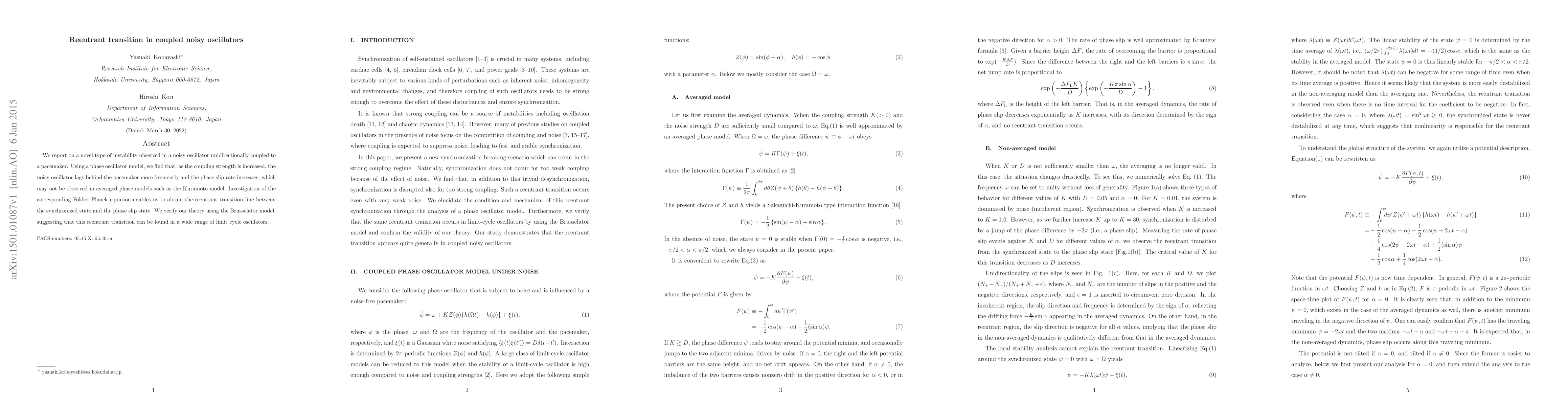 This paper investigates a novel instability in a noisy oscillator coupled to a pacemaker, revealing a reentrant transition between synchronized and phase slip states as coupling strength increases. Theoretical analysis using a phase oscillator model and the Fokker-Planck equation, along with verification via the Brusselator model, suggests this phenomenon is widespread among limit cycle oscillators.