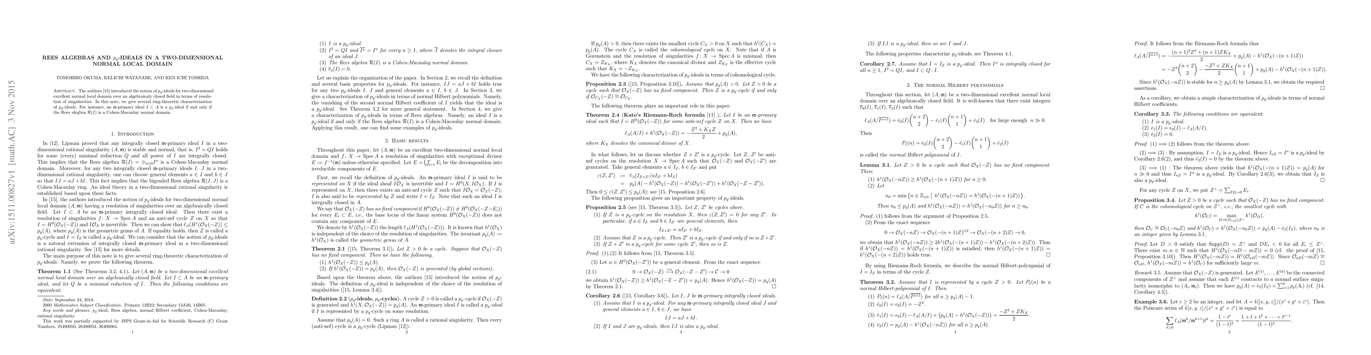 This paper introduces $p_g$-ideals in two-dimensional excellent normal local domains and provides ring-theoretic characterizations. It concludes that an $m$-primary ideal $I$ is a $p_g$-ideal if its Rees algebra $\mathcal{R}(I)$ is a Cohen-Macaulay normal domain.