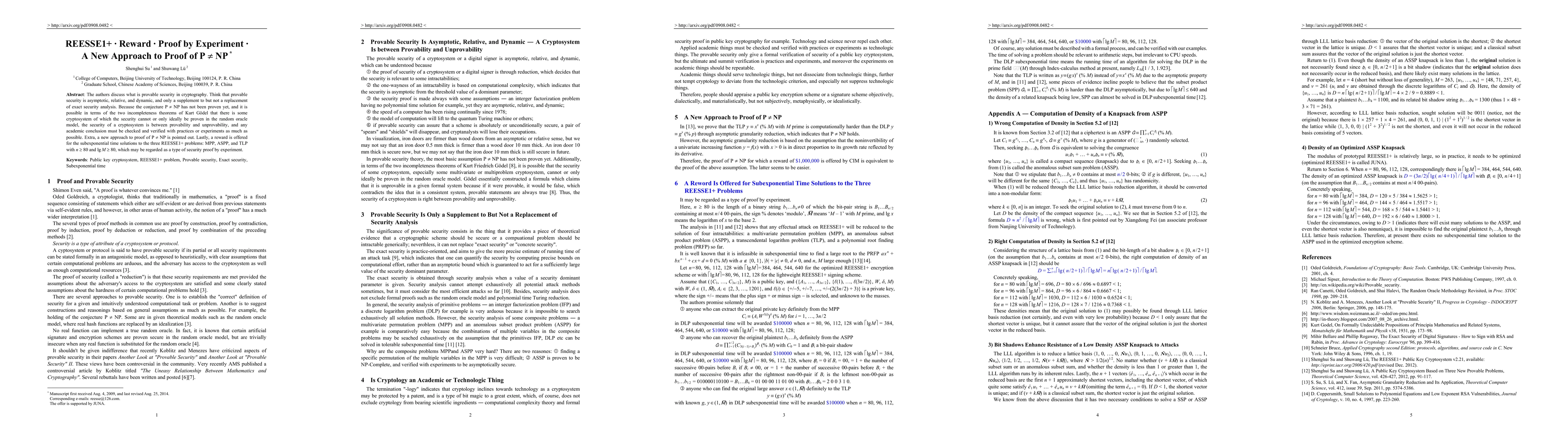 The authors discuss what is provable security in cryptography. Think that provable security is asymptotic, relative, and dynamic, and only a supplement to but not a replacement of exact security analysis. Because the conjecture P != NP has not been proven yet, and it is possible in terms of the two incompleteness theorems of Kurt Godel that there is some cryptosystem of which the security cannot or only ideally be proven in the random oracle model, the security of a cryptosystem is between provability and unprovability, and any academic conclusion must be checked and verified with practices or experiments as much as possible. Extra, a new approach to proof of P != NP is pointed out. Lastly, a reward is offered for the subexponential time solutions to the three REESSE1+ problems: MPP, ASPP, and TLP with n >= 80 and lg M >= 80, which may be regarded as a type of security proof by experiment.