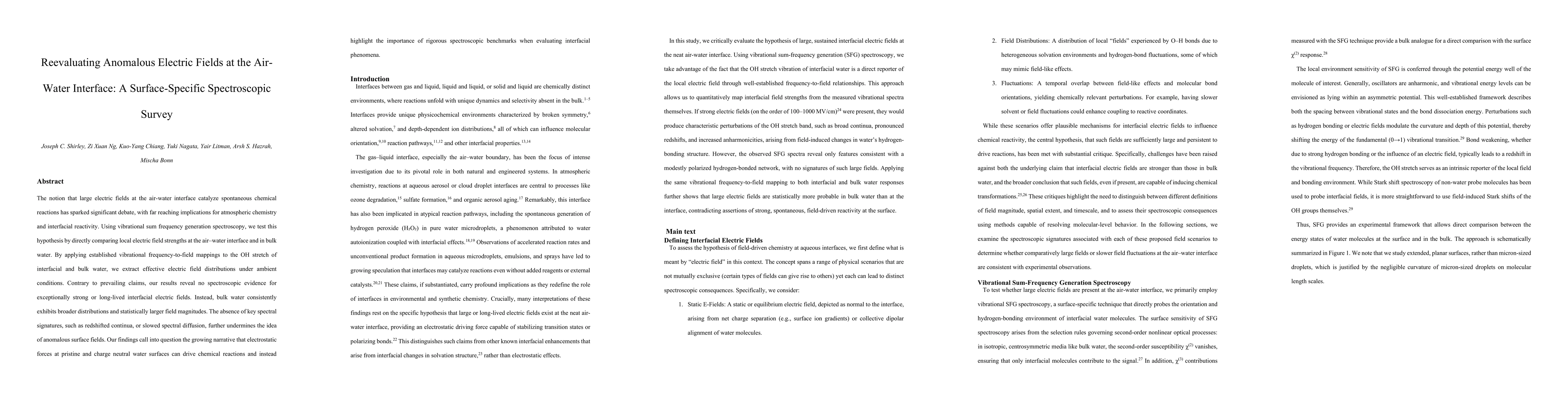 The notion that large electric fields at the air-water interface catalyze spontaneous chemical reactions has sparked significant debate, with far reaching implications for atmospheric chemistry and interfacial reactivity. Using vibrational sum frequency generation spectroscopy, we test this hypothesis by directly comparing local electric field strengths at the air-water interface and in bulk water. By applying established vibrational frequency-to-field mappings to the OH stretch of interfacial and bulk water, we extract effective electric field distributions under ambient conditions. Contrary to prevailing claims, our results reveal no spectroscopic evidence for exceptionally strong or long-lived interfacial electric fields. Instead, bulk water consistently exhibits broader distributions and statistically larger field magnitudes. The absence of key spectral signatures, such as redshifted continua, or slowed spectral diffusion, further undermines the idea of anomalous surface fields. Our findings call into question the growing narrative that electrostatic forces at pristine and charge neutral water surfaces can drive chemical reactions and instead highlight the importance of rigorous spectroscopic benchmarks when evaluating interfacial phenomena.