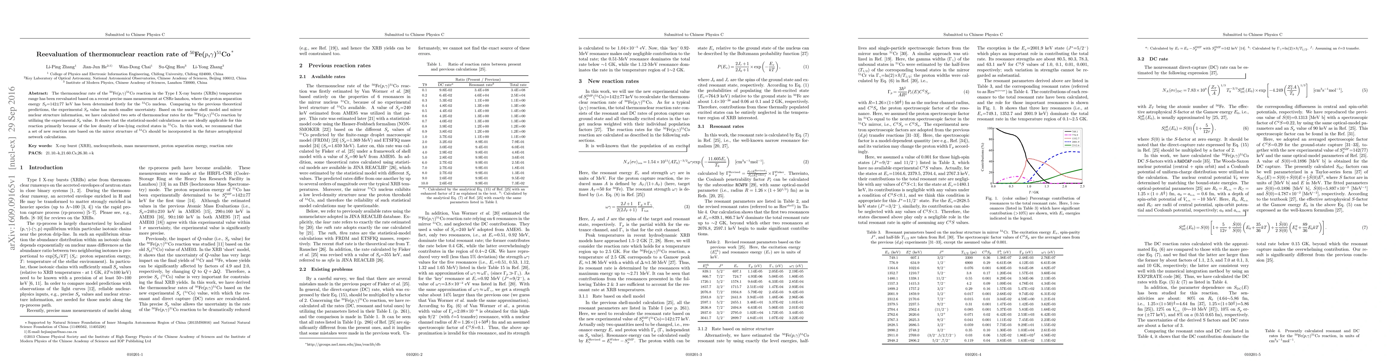 The paper presents a reevaluation of the 50Fe(p,gamma)51Co thermonuclear reaction rate using an experimental Sp value, leading to two alternative sets of reaction rates based on shell model and mirror structure of 51Cr.