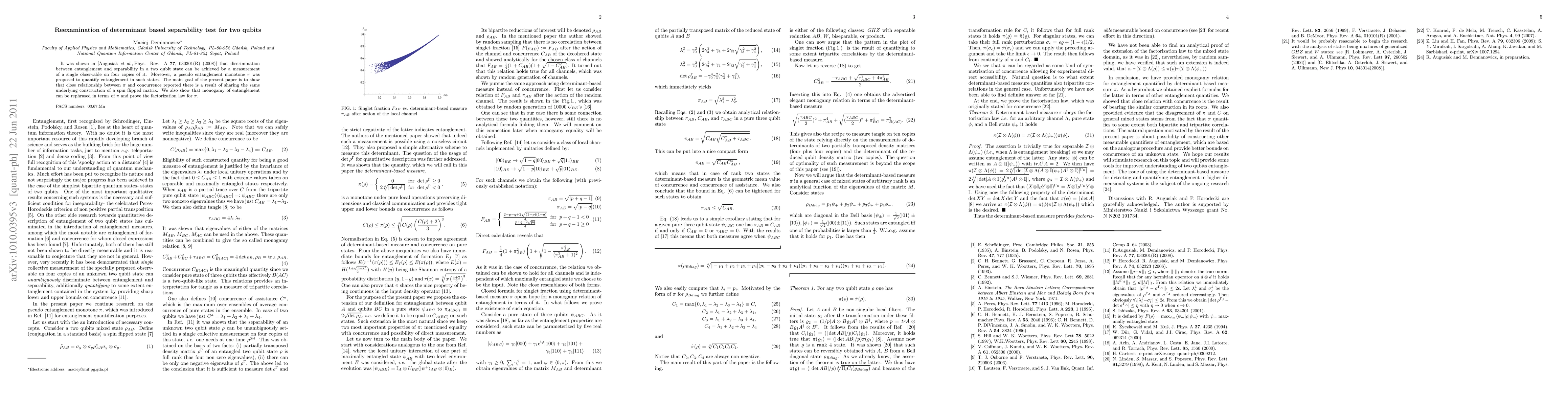 This paper reexamines the determinant-based separability test for two qubits, demonstrating that the previously reported relationship between a pseudo entanglement monotone $\pi$ and concurrence stems from a shared spin flipped matrix construction. It also proves the factorization law for $\pi$ and reinterprets the monogamy of entanglement in its terms.