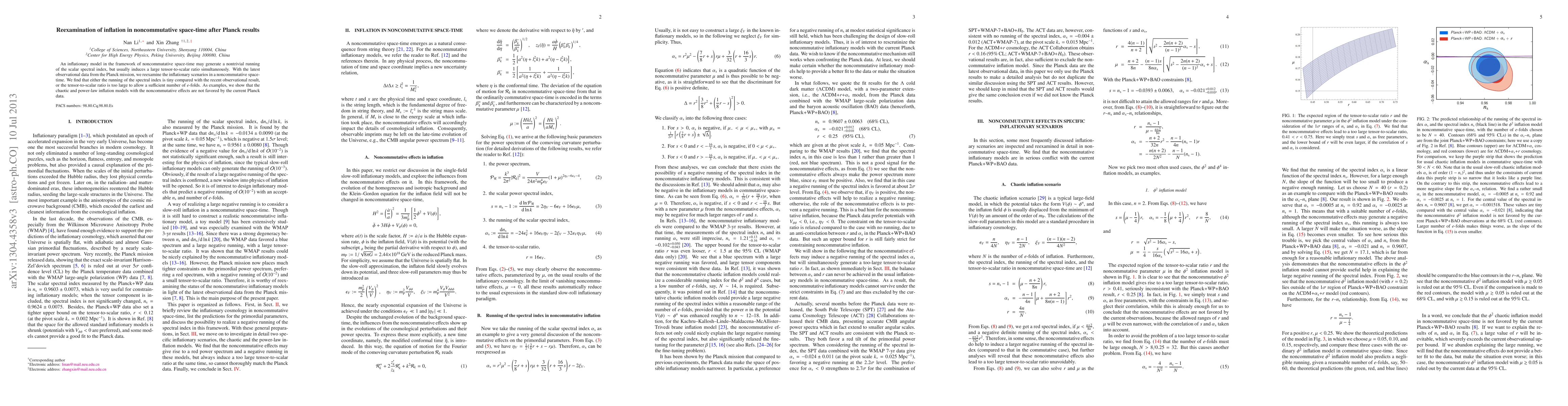 An inflationary model in the framework of noncommutative space-time may generate a nontrivial running of the scalar spectral index, but usually induces a large tensor-to-scalar ratio simultaneously. With the latest observational data from the Planck mission, we reexamine the inflationary scenarios in a noncommutative space-time. We find that either the running of the spectral index is tiny compared with the recent observational result, or the tensor-to-scalar ratio is too large to allow a sufficient number of $e$-folds. As examples, we show that the chaotic and power-law inflation models with the noncommutative effects are not favored by the current Planck data.