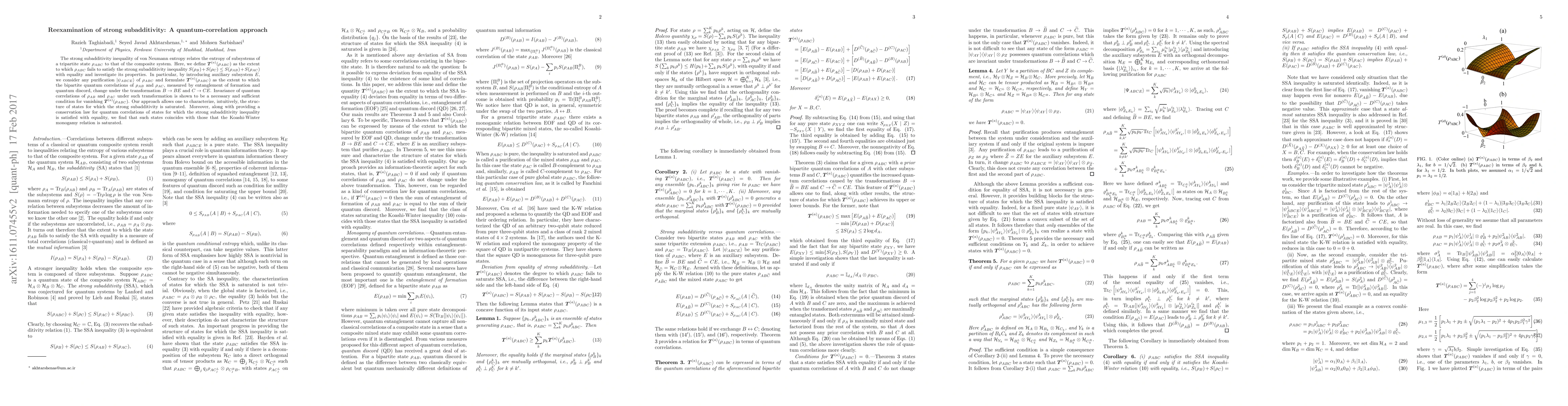 The strong subadditivity inequality of von Neumann entropy relates the entropy of subsystems of a tripartite state $\rho_{ABC}$ to that of the composite system. Here, we define $\boldsymbol{T}^{(a)}(\rho_{ABC})$ as the extent to which $\rho_{ABC}$ fails to satisfy the strong subadditivity inequality $S(\rho_{B})+S(\rho_{C}) \le S(\rho_{AB})+S(\rho_{AC})$ with equality and investigate its properties. In particular, by introducing auxiliary subsystem $E$, we consider any purification $|\psi_{ABCE}\rangle$ of $\rho_{ABC}$ and formulate $\boldsymbol{T}^{(a)}(\rho_{ABC})$ as the extent to which the bipartite quantum correlations of $\rho_{AB}$ and $\rho_{AC}$, measured by entanglement of formation and quantum discord, change under the transformation $B\rightarrow BE$ and $C\rightarrow CE$. Invariance of quantum correlations of $\rho_{AB}$ and $\rho_{AC}$ under such transformation is shown to be a necessary and sufficient condition for vanishing $\boldsymbol{T}^{(a)}(\rho_{ABC})$. Our approach allows one to characterize, intuitively, the structure of states for which the strong subadditivity is saturated. Moreover, along with providing a conservation law for quantum correlations of states for which the strong subadditivity inequality is satisfied with equality, we find that such states coincides with those that the Koashi-Winter monogamy relation is saturated.