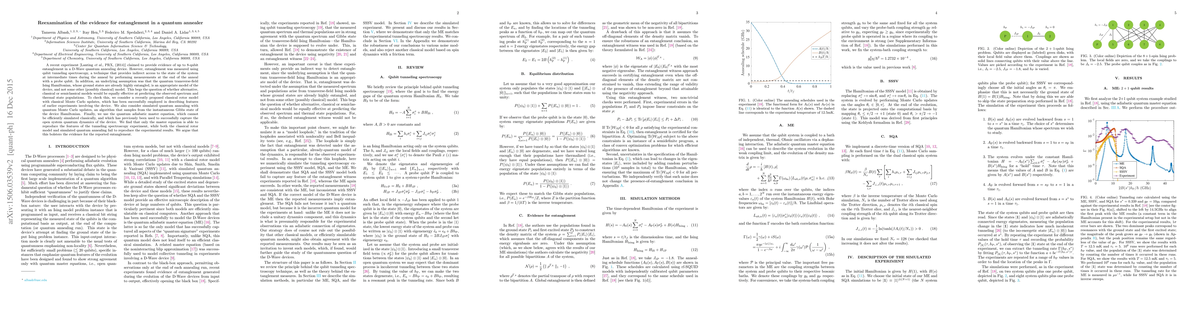A recent experiment [Lanting et al., PRX, (2014)] claimed to provide evidence of up to $8$-qubit entanglement in a D-Wave quantum annealing device. However, entanglement was measured using qubit tunneling spectroscopy, a technique that provides indirect access to the state of the system at intermediate times during the anneal by performing measurements at the end of the anneal with a probe qubit. In addition, an underlying assumption was that the quantum transverse-field Ising Hamiltonian, whose ground states are already highly entangled, is an appropriate model of the device, and not some other (possibly classical) model. This begs the question of whether alternative, classical or semiclassical models would be equally effective at predicting the observed spectrum and thermal state populations. To check this, we consider a recently proposed classical rotor model with classical Monte Carlo updates, which has been successfully employed in describing features of earlier experiments involving the device. We also consider simulated quantum annealing with quantum Monte Carlo updates, an algorithm that samples from the instantaneous Gibbs state of the device Hamiltonian. Finally, we use the quantum adiabatic master equation, which cannot be efficiently simulated classically, and which has previously been used to successfully capture the open system quantum dynamics of the device. We find that only the master equation is able to reproduce the features of the tunneling spectroscopy experiment, while both the classical rotor model and simulated quantum annealing fail to reproduce the experimental results. We argue that this bolsters the evidence for the reported entanglement.