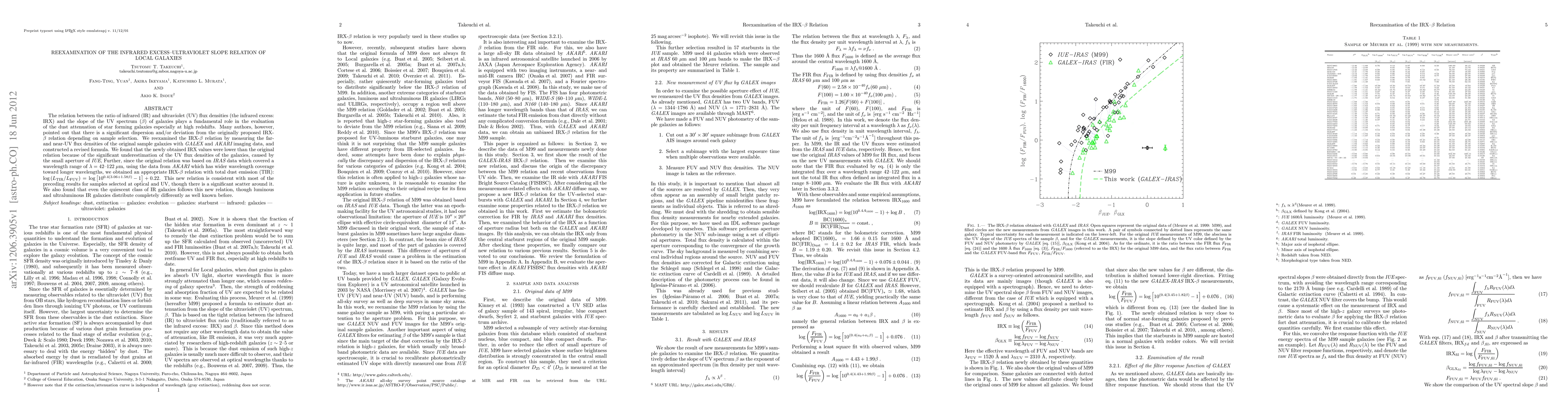 The relation between the ratio of infrared (IR) and ultraviolet (UV) flux densities (the infrared excess: IRX) and the slope of the UV spectrum (\beta) of galaxies plays a fundamental role in the evaluation of the dust attenuation of star forming galaxies especially at high redshifts. Many authors, however, pointed out that there is a significant dispersion and/or deviation from the originally proposed IRX-\beta relation depending on sample selection. We reexamined the IRX-\beta relation by measuring the far- and near-UV flux densities of the original sample galaxies with GALEX and AKARI imaging data, and constructed a revised formula. We found that the newly obtained IRX values were lower than the original relation because of the significant underestimation of the UV flux densities of the galaxies, caused by the small aperture of IUE, Further, since the original relation was based on IRAS data which covered a wavelength range of \lambda = 42--122\mum, using the data from AKARI which has wider wavelength coverage toward longer wavelengths, we obtained an appropriate IRX-\beta relation with total dust emission (TIR): \log(L_{\rm TIR}/L_{\rm FUV}) = \log [10^{0.4(3.06+1.58\beta)}-1] +0.22. This new relation is consistent with most of the preceding results for samples selected at optical and UV, though there is a significant scatter around it. We also found that even the quiescent class of IR galaxies follows this new relation, though luminous and ultraluminous IR galaxies distribute completely differently as well known before.