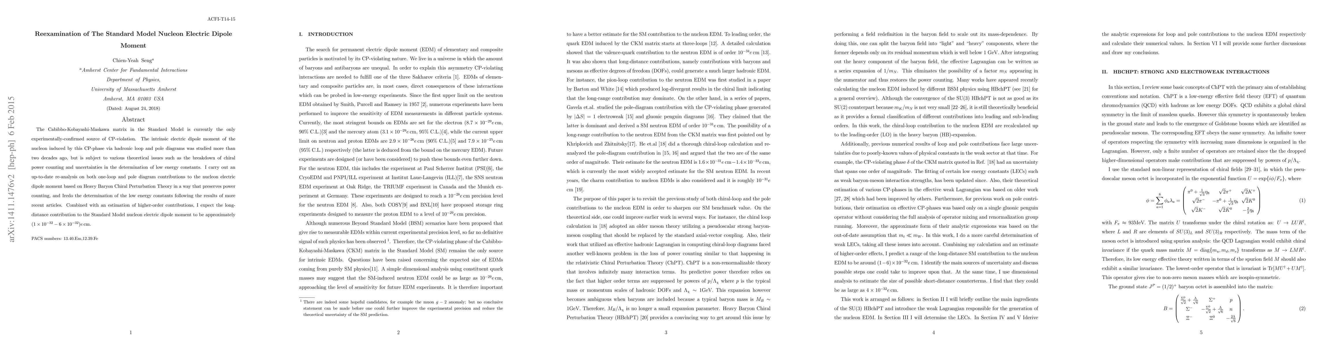 This paper reexamines the Standard Model nucleon electric dipole moment, focusing on the CP-violation from the Cabibbo-Kobayashi-Maskawa matrix. It updates calculations using Heavy Baryon Chiral Perturbation Theory to address theoretical issues, leading to a refined estimate of $(1\times10^{-32}-6\times10^{-32})e\,\mathrm{cm}$ for the long-distance contribution.