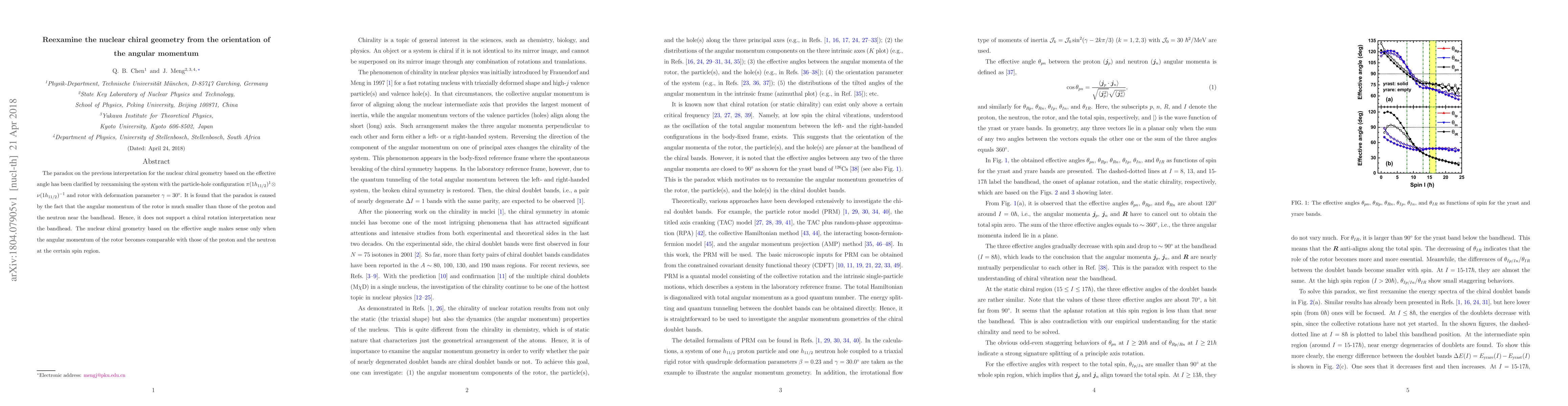 The paradox on the previous interpretation for the nuclear chiral geometry based on the effective angle has been clarified by reexamining the system with the particle-hole configuration $\pi (1h_{11/2})^1 \otimes \nu(1h_{11/2})^{-1}$ and rotor with deformation parameter $\gamma=30^\circ$. It is found that the paradox is caused by the fact that the angular momentum of the rotor is much smaller than those of the proton and the neutron near the bandhead. Hence, it does not support a chiral rotation interpretation near the bandhead. The nuclear chiral geometry based on the effective angle makes sense only when the angular momentum of the rotor becomes comparable with those of the proton and the neutron at the certain spin region.
