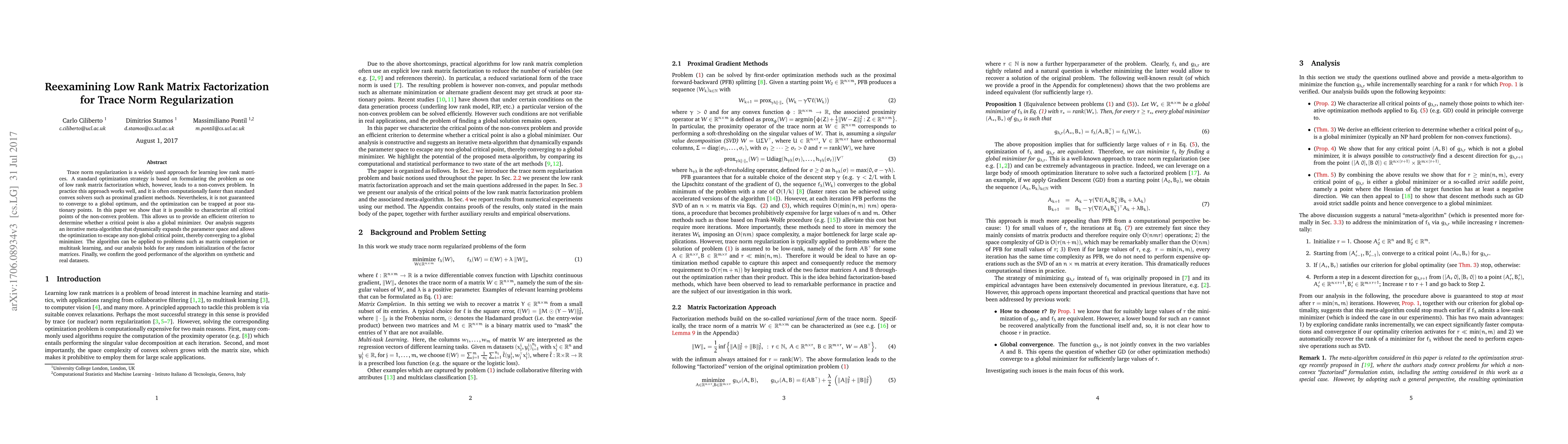 This paper proposes an iterative meta-algorithm to improve the convergence of low rank matrix factorization with trace norm regularization, ensuring it escapes non-global critical points and finds global minimizers. The algorithm dynamically expands the parameter space and performs well on both synthetic and real datasets.