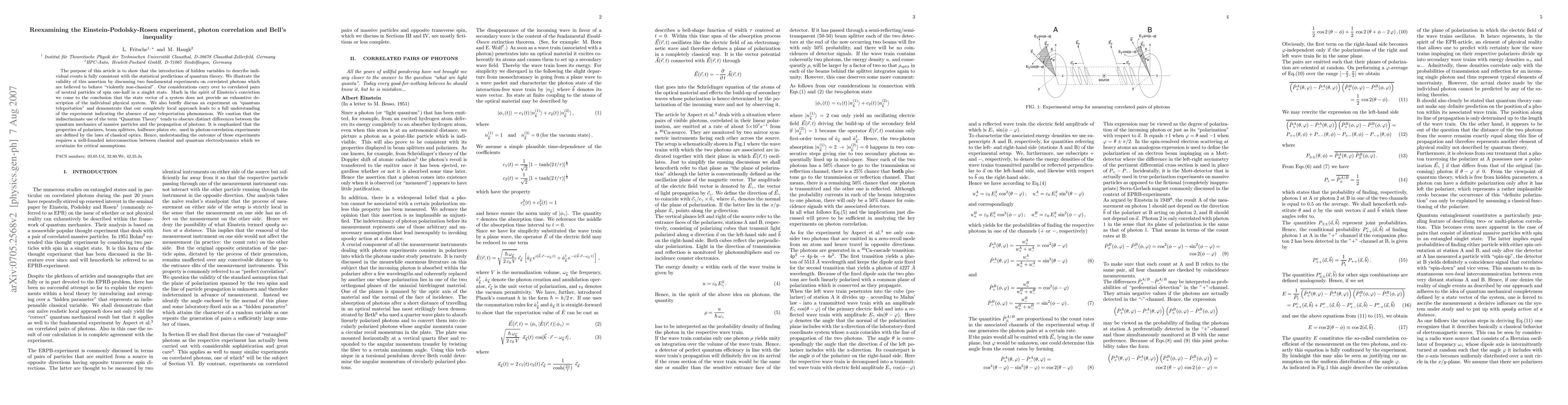 The purpose of this article is to show that the introduction of hidden variables to describe individual events is fully consistent with the statistical predictions of quantum theory. We illustrate the validity of this assertion by discussing two fundamental experiments on correlated photons which are believed to behave ``violently non-classical''. Our considerations carry over to correlated pairs of neutral particles of spin one-half in a singlet state. Much in the spirit of Einstein's conviction we come to the conclusion that the state vector of a system does not provide an exhaustive description of the individual physical system. We also briefly discuss an experiment on ``quantum teleportation'' and demonstrate that our completely local approach leads to a full understanding of the experiment indicating the absence of any teleportation phenomenon. We caution that the indiscriminated use of the term ``Quantum Theory'' tends to obscure distinct differences between the quantum mechanics of massive particles and the propagation of photons. It is emphasized that the properties of polarizers, beam splitters, halfwave plates etc. used in photon-correlation experiments are defined by the laws of classical optics. Hence, understanding the outcome of those experiments requires a well-founded interconnection between classical and quantum electrodynamics free from unnecessary hypotheses.