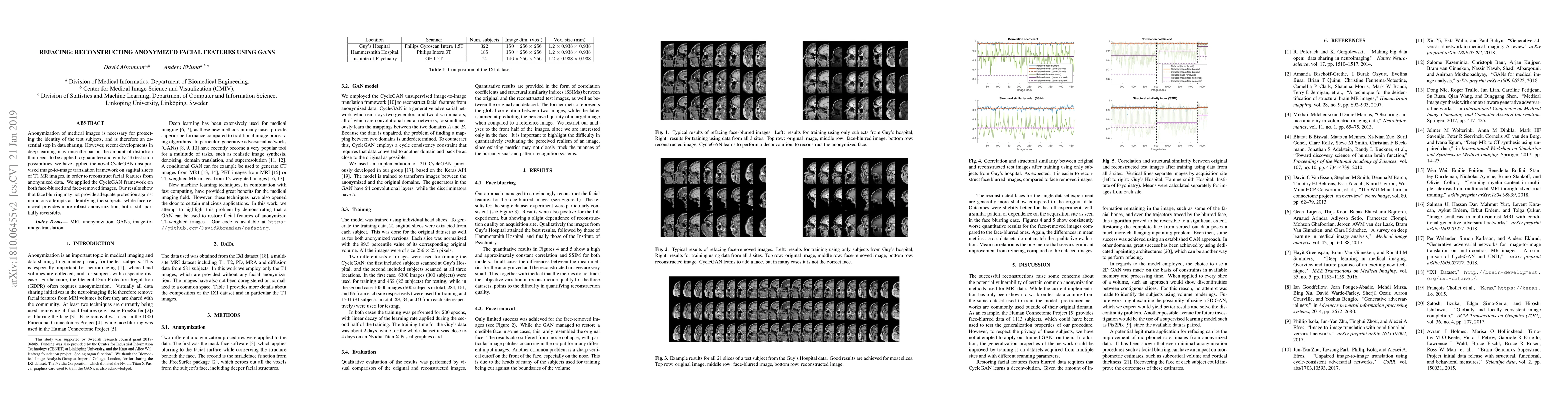 A study used GANs to reconstruct facial features from anonymized medical images, finding that face blurring is not enough to protect identities while face removal provides more robust anonymity.