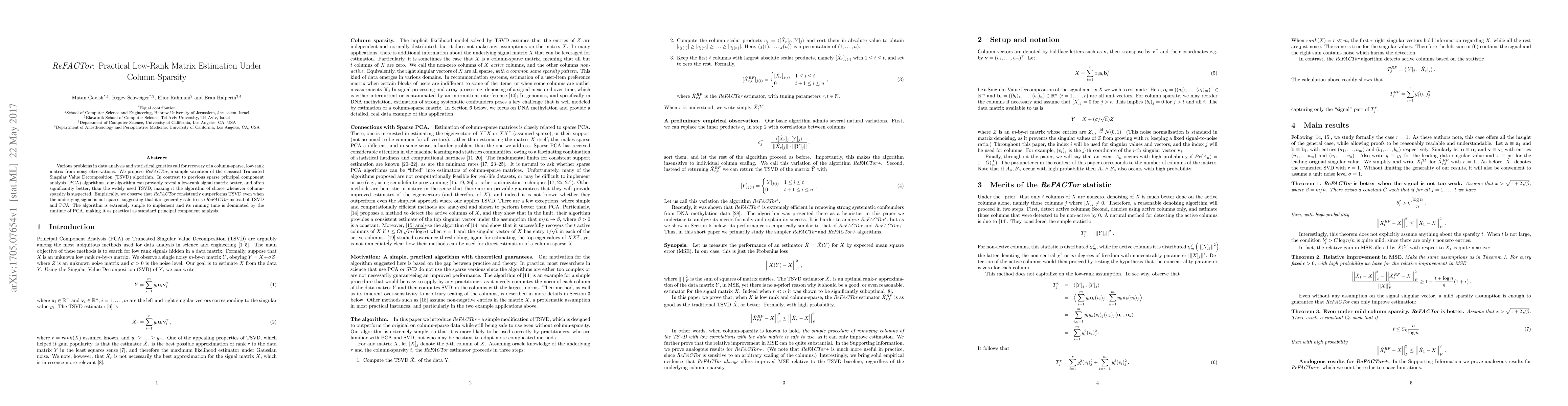 ReFACTor is a novel algorithm for estimating low-rank, column-sparse matrices from noisy observations, outperforming classical Truncated Singular Value Decomposition (TSVD) and sparse PCA. Empirically, it consistently shows better performance, even when the underlying signal is not sparse, making it a practical and efficient alternative.
