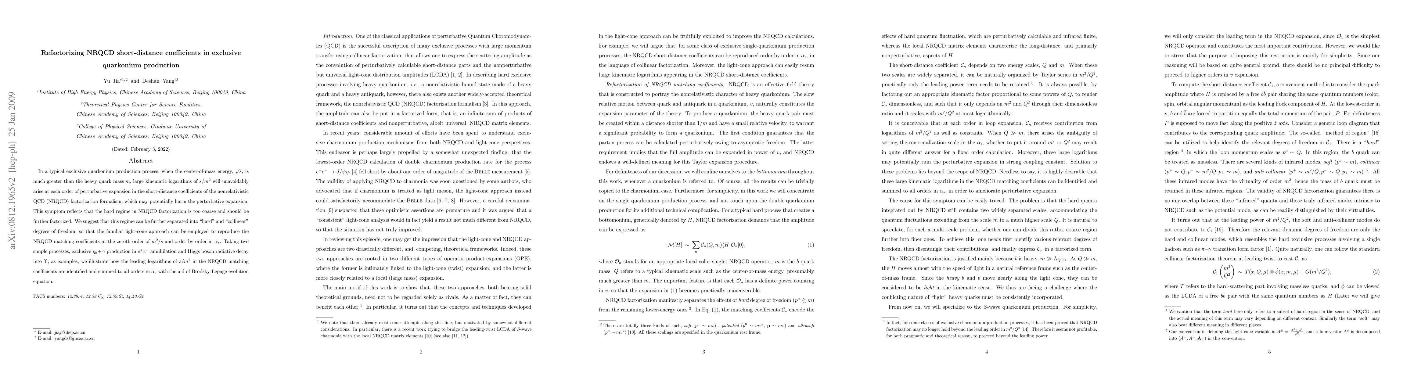 This paper proposes a method to refactorize the short-distance coefficients in NRQCD for exclusive quarkonium production, addressing large kinematic logarithms that threaten perturbative expansion. It suggests separating the hard regime into "hard" and "collinear" degrees of freedom to employ the light-cone approach, illustrated through examples of $\eta_b+\gamma$ production and Higgs decay into $\Upsilon$.