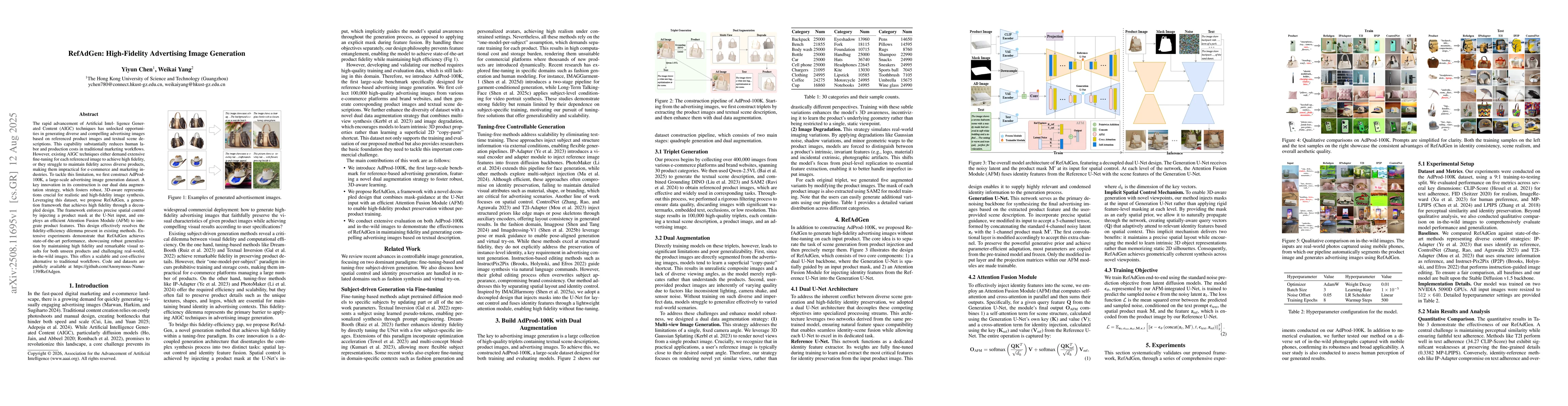 The rapid advancement of Artificial Intelligence Generated Content (AIGC) techniques has unlocked opportunities in generating diverse and compelling advertising images based on referenced product images and textual scene descriptions. This capability substantially reduces human labor and production costs in traditional marketing workflows. However, existing AIGC techniques either demand extensive fine-tuning for each referenced image to achieve high fidelity, or they struggle to maintain fidelity across diverse products, making them impractical for e-commerce and marketing industries. To tackle this limitation, we first construct AdProd-100K, a large-scale advertising image generation dataset. A key innovation in its construction is our dual data augmentation strategy, which fosters robust, 3D-aware representations crucial for realistic and high-fidelity image synthesis. Leveraging this dataset, we propose RefAdGen, a generation framework that achieves high fidelity through a decoupled design. The framework enforces precise spatial control by injecting a product mask at the U-Net input, and employs an efficient Attention Fusion Module (AFM) to integrate product features. This design effectively resolves the fidelity-efficiency dilemma present in existing methods. Extensive experiments demonstrate that RefAdGen achieves state-of-the-art performance, showcasing robust generalization by maintaining high fidelity and remarkable visual results for both unseen products and challenging real-world, in-the-wild images. This offers a scalable and cost-effective alternative to traditional workflows. Code and datasets are publicly available at https://github.com/Anonymous-Name-139/RefAdgen.