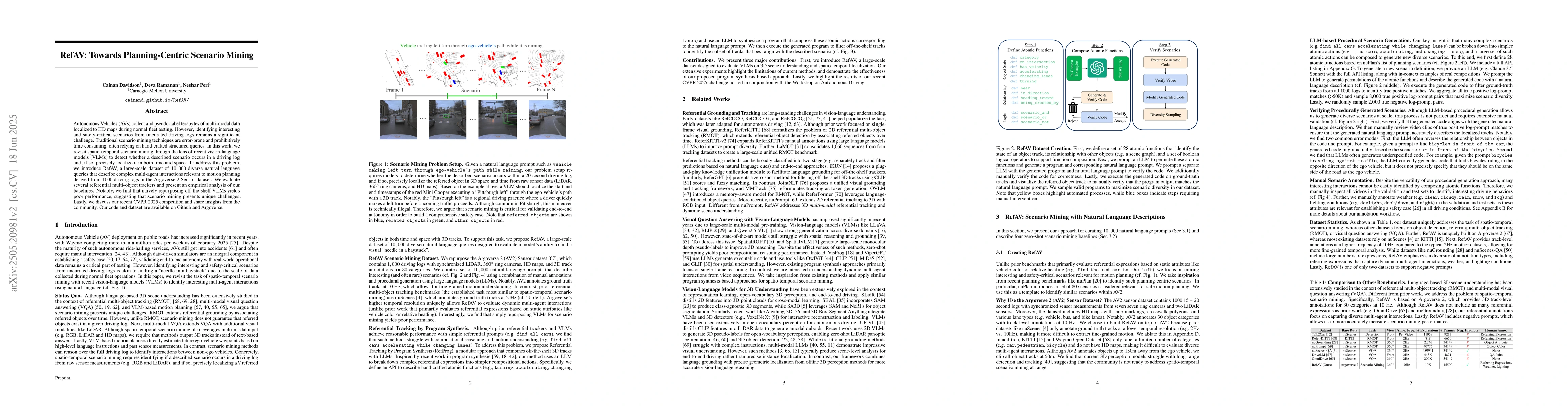 RefAV and the planning-centric approach to scenario mining using VLMs differentiate this work from traditional, error-prone, and time-consuming methods that rely on hand-crafted structured queries.