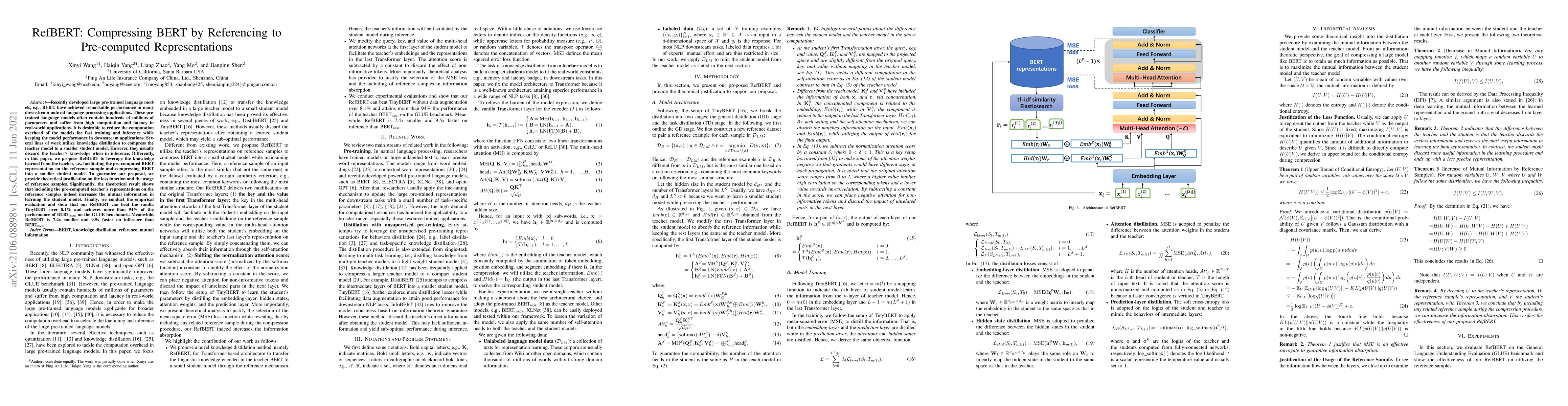 Recently developed large pre-trained language models, e.g., BERT, have achieved remarkable performance in many downstream natural language processing applications. These pre-trained language models often contain hundreds of millions of parameters and suffer from high computation and latency in real-world applications. It is desirable to reduce the computation overhead of the models for fast training and inference while keeping the model performance in downstream applications. Several lines of work utilize knowledge distillation to compress the teacher model to a smaller student model. However, they usually discard the teacher's knowledge when in inference. Differently, in this paper, we propose RefBERT to leverage the knowledge learned from the teacher, i.e., facilitating the pre-computed BERT representation on the reference sample and compressing BERT into a smaller student model. To guarantee our proposal, we provide theoretical justification on the loss function and the usage of reference samples. Significantly, the theoretical result shows that including the pre-computed teacher's representations on the reference samples indeed increases the mutual information in learning the student model. Finally, we conduct the empirical evaluation and show that our RefBERT can beat the vanilla TinyBERT over 8.1\% and achieves more than 94\% of the performance of $\BERTBASE$ on the GLUE benchmark. Meanwhile, RefBERT is 7.4x smaller and 9.5x faster on inference than BERT$_{\rm BASE}$.