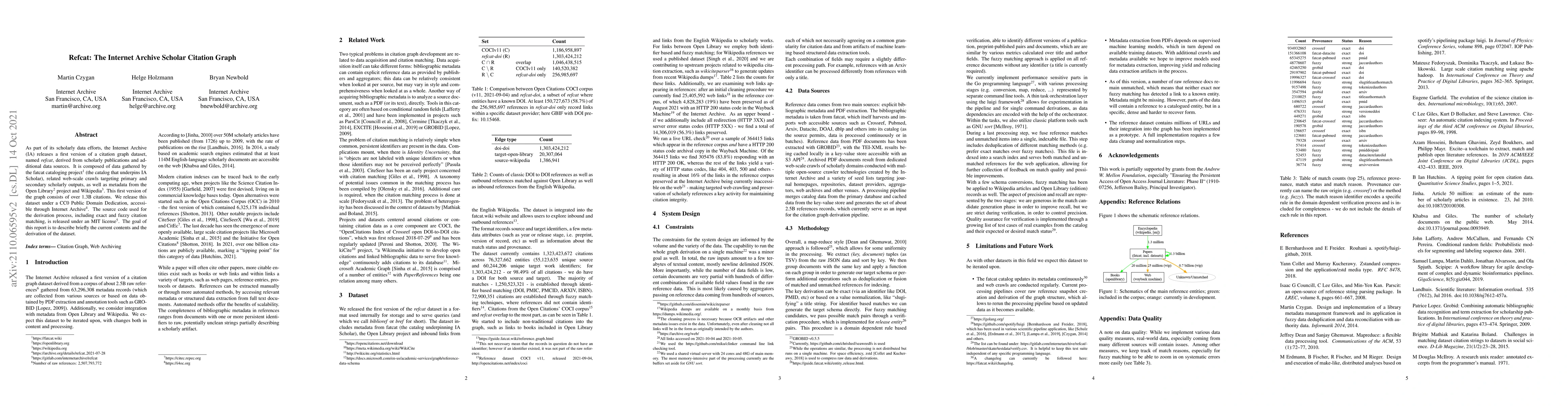 The Internet Archive releases a citation graph dataset, refcat, containing over 1.3 billion citations from scholarly publications and additional sources. The dataset is released under a CC0 Public Domain Dedication, with the derivation code available under an MIT license.