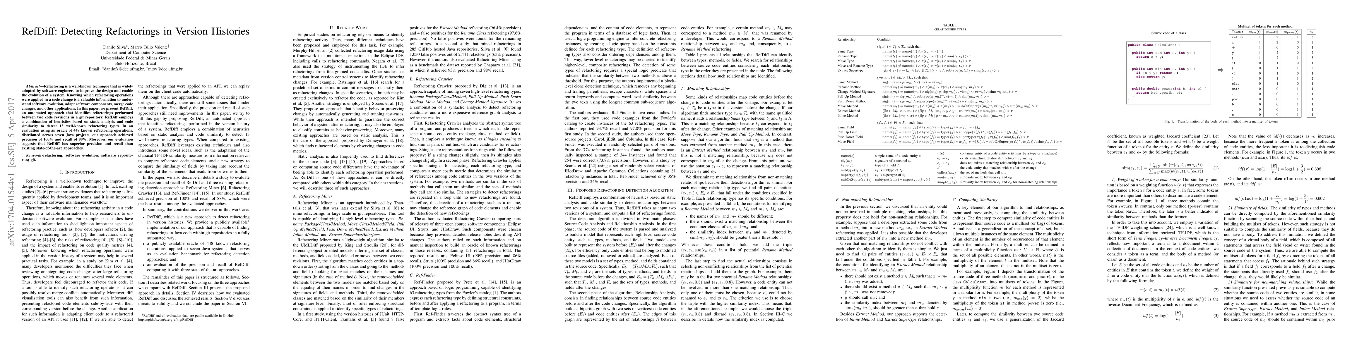 RefDiff is an automated method for detecting refactorings in version histories using static analysis and code similarity. It achieved 100% precision and 88% recall in identifying 13 refactoring types across seven Java projects, outperforming existing techniques.