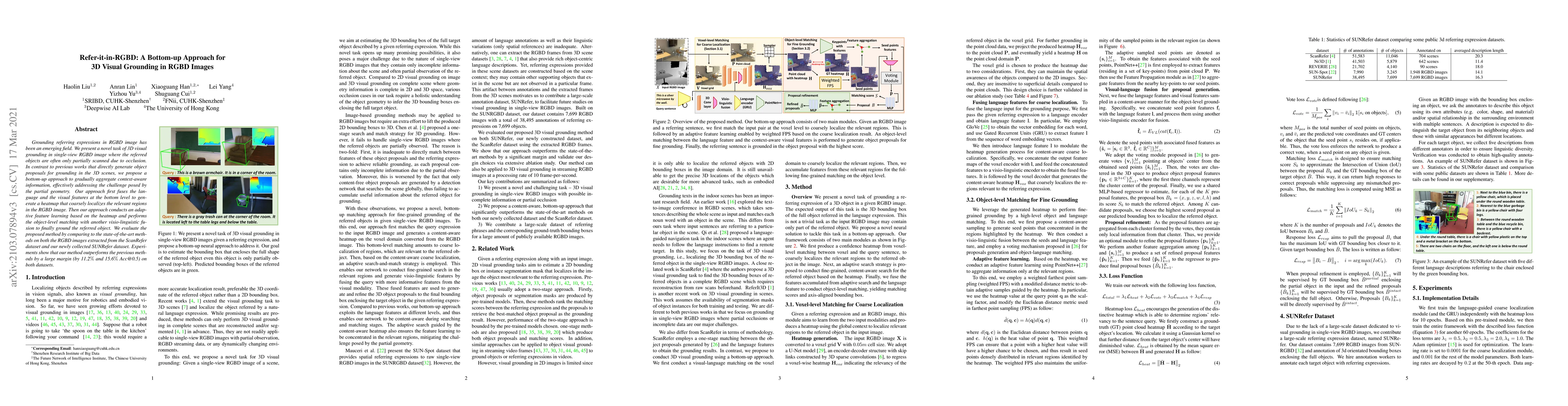 Refer-it-in-RGBD introduces a bottom-up approach for 3D visual grounding in single-view RGBD images, addressing partial geometry due to occlusion. The method fuses language and visual features to generate a heatmap, followed by adaptive feature learning and object-level matching, outperforming previous methods by 11.2% and 15.6% on two datasets.
