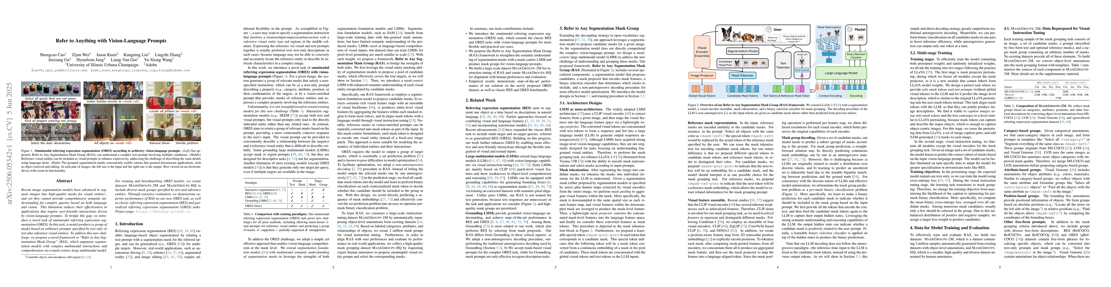 The research introduces a novel task called omnimodal referring expression segmentation (ORES), which requires a model to produce a group of masks based on text-only or text plus visual entity references. A framework named 'Refer to Any Segmentation Mask Group' (RAS) is proposed to augment segmentation models with multimodal interactions and comprehension using a mask-centric large multimodal model. Training and benchmarking datasets, MaskGroups-2M and MaskGroups-HQ, are created for diverse mask groups specified by text and visual entities.
