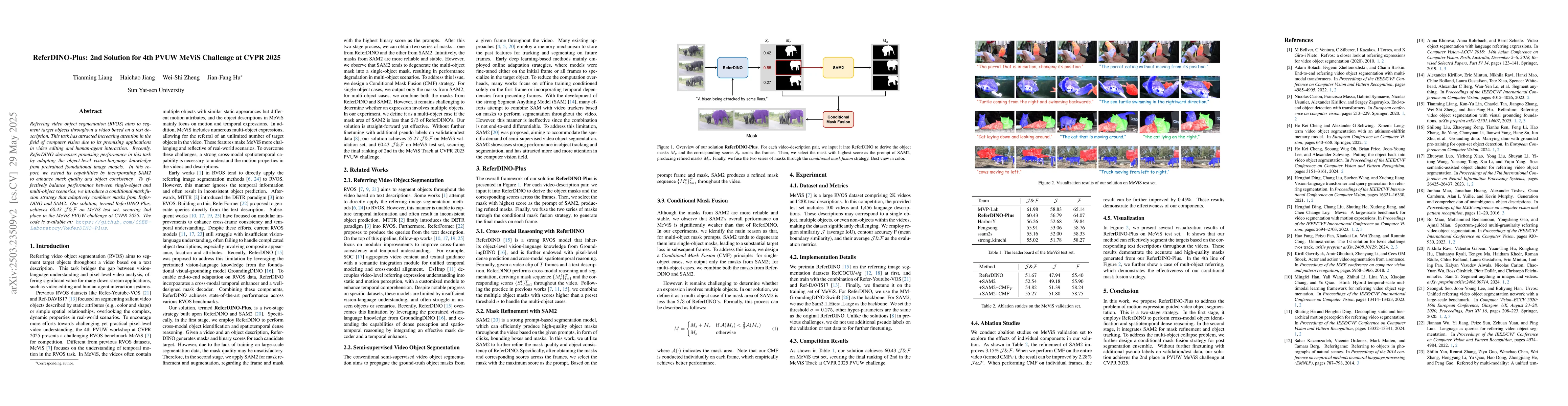 The paper enhances ReferDINO for RVOS by integrating SAM2's mask quality and object consistency, and introduces a conditional mask fusion strategy for balancing single-object and multi-object scenarios.