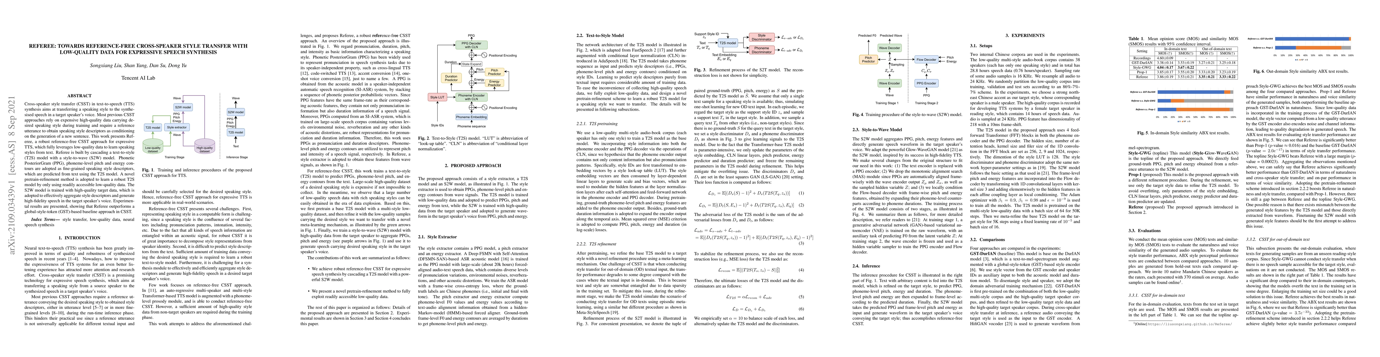 Referee introduces a reference-free cross-speaker style transfer method for expressive text-to-speech synthesis using low-quality data. It employs a cascade of a text-to-style model and a style-to-wave model, leveraging fine-grained style descriptors from text, and achieves better performance than traditional baselines.