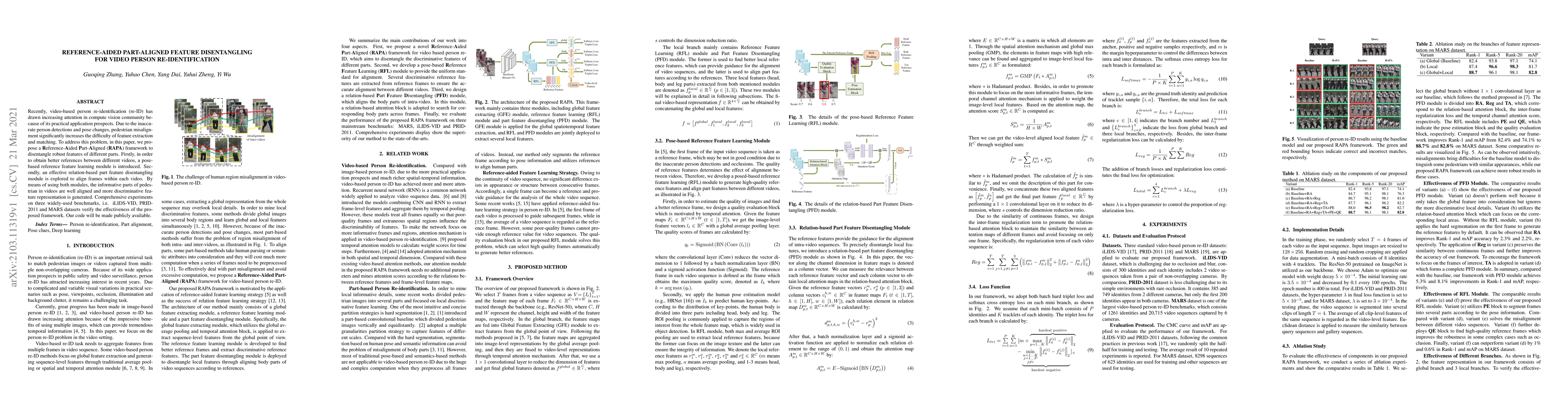 This paper proposes a Reference-Aided Part-Aligned (RAPA) framework for video-based person re-identification, addressing the challenges of pedestrian misalignment due to inaccurate detections and pose changes. The framework uses a pose-based reference feature learning module and a relation-based part feature disentangling module to align and extract discriminative features from different parts of pedestrians, validated on three benchmarks.