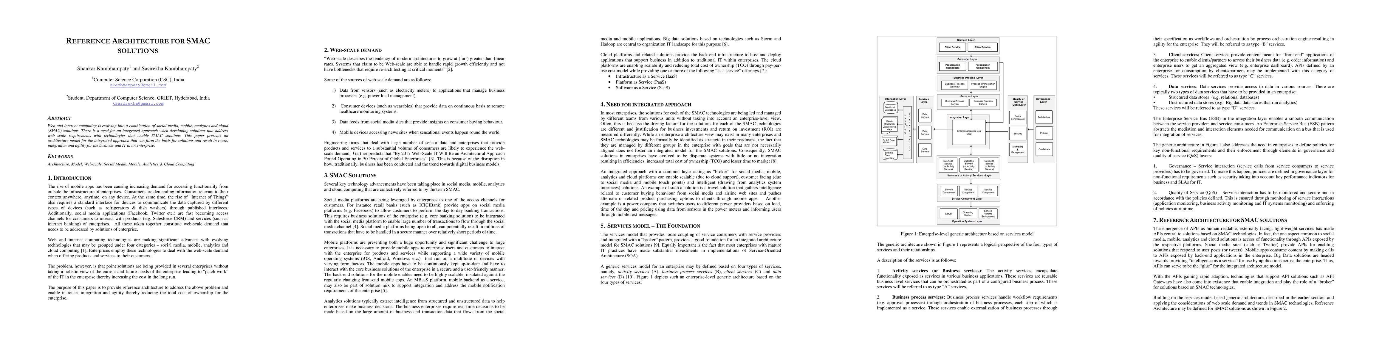 This paper proposes a reference architecture for SMAC (Social Media, Mobile, Analytics, Cloud) solutions to meet web scale requirements, emphasizing integration, reuse, and agility for enterprise IT and business operations. The architecture model aims to facilitate the development of cohesive solutions leveraging these technologies.