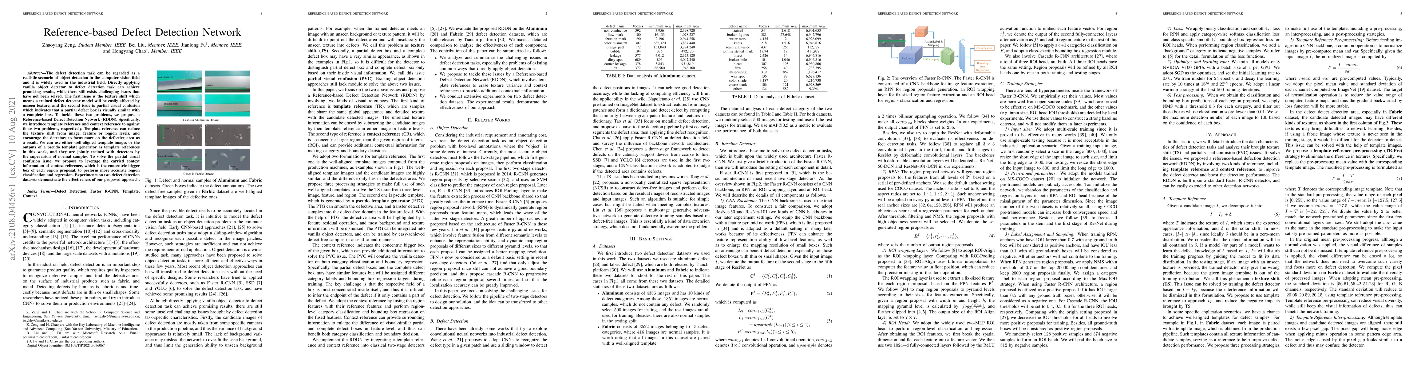 The paper proposes a Reference-based Defect Detection Network (RDDN) to address texture shift and partial visual confusion in defect detection. It uses template and context references to enhance detection accuracy and focus on defective areas. Experimental results show improved performance on two datasets.