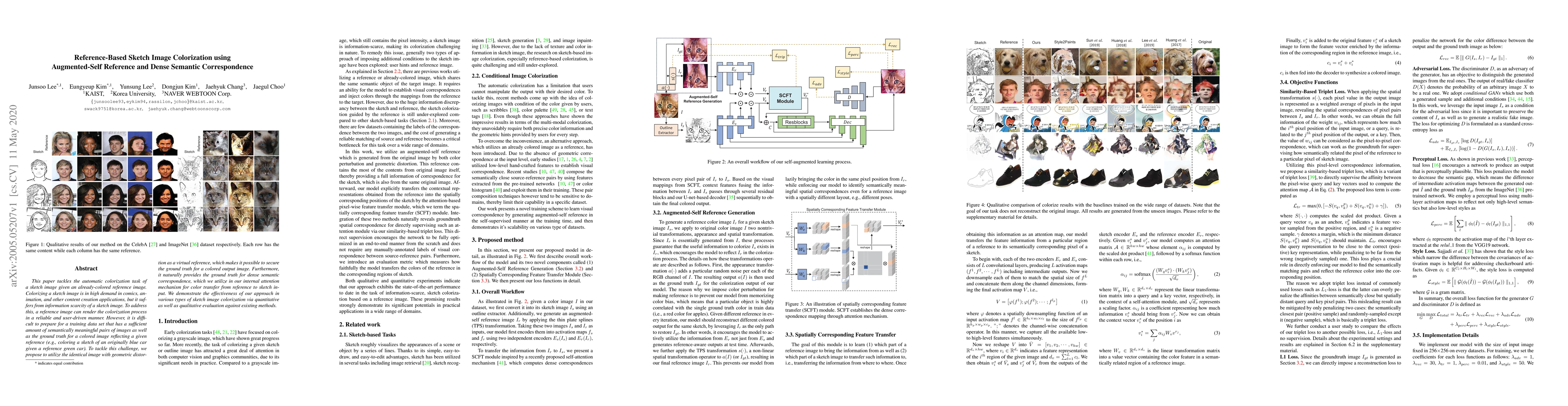 This paper proposes a method for automatically colorizing sketch images using a colored reference image and augmented-self reference with dense semantic correspondence, addressing the challenge of information scarcity in sketches. The approach leverages geometric distortion of the same image to generate necessary ground truth data for color transfer and semantic correspondence.