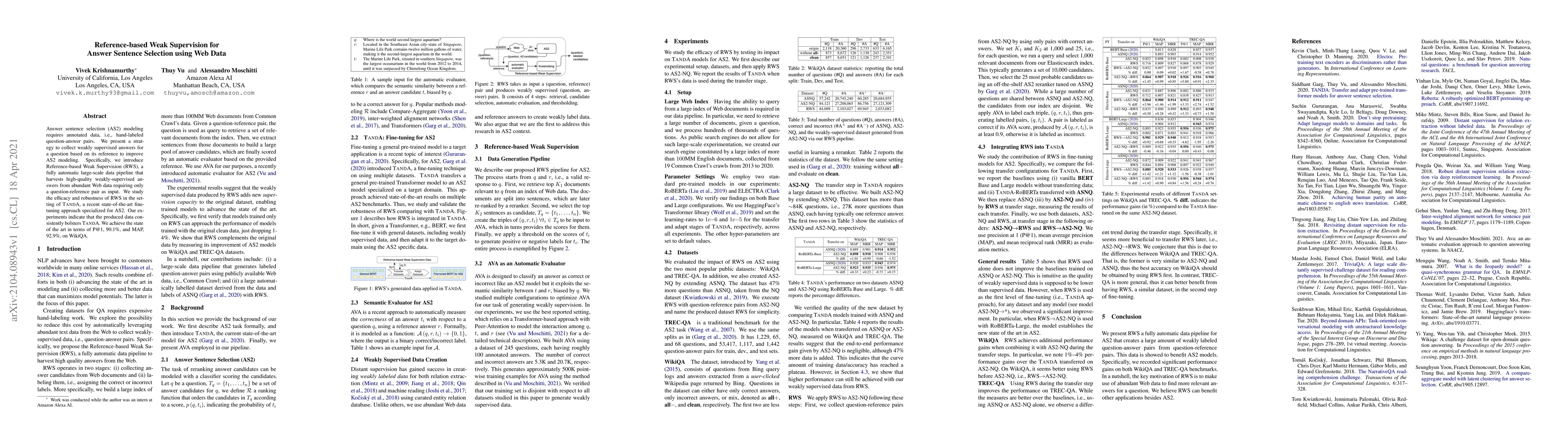 Answer sentence selection (AS2) modeling requires annotated data, i.e., hand-labeled question-answer pairs. We present a strategy to collect weakly supervised answers for a question based on its reference to improve AS2 modeling. Specifically, we introduce Reference-based Weak Supervision (RWS), a fully automatic large-scale data pipeline that harvests high-quality weakly-supervised answers from abundant Web data requiring only a question-reference pair as input. We study the efficacy and robustness of RWS in the setting of TANDA, a recent state-of-the-art fine-tuning approach specialized for AS2. Our experiments indicate that the produced data consistently bolsters TANDA. We achieve the state of the art in terms of P@1, 90.1%, and MAP, 92.9%, on WikiQA.