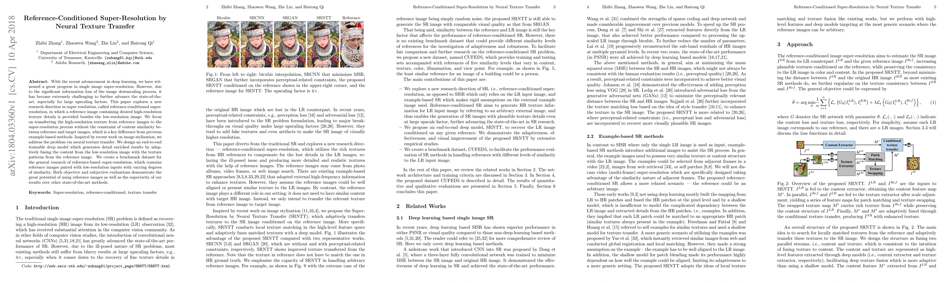 This paper introduces a novel reference-conditioned super-resolution method that leverages a high-resolution reference image to transfer detailed textures, enhancing the super-resolution of low-resolution images. The proposed neural texture transfer model adaptively fuses content from the low-resolution image with texture from the reference, outperforming existing methods in both objective and subjective evaluations.