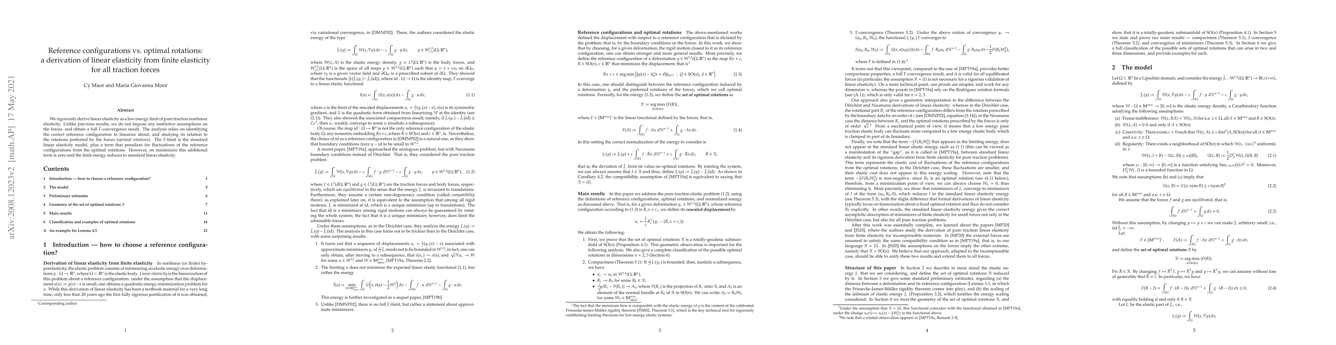 We rigorously derive linear elasticity as a low energy limit of pure traction nonlinear elasticity. Unlike previous results, we do not impose any restrictive assumptions on the forces, and obtain a full $\Gamma$-convergence result. The analysis relies on identifying the correct reference configuration to linearize about, and studying its relation to the rotations preferred by the forces (optimal rotations). The $\Gamma$-limit is the standard linear elasticity model, plus a term that penalizes for fluctuations of the reference configurations from the optimal rotations. However, on minimizers this additional term is zero and the limit energy reduces to standard linear elasticity.