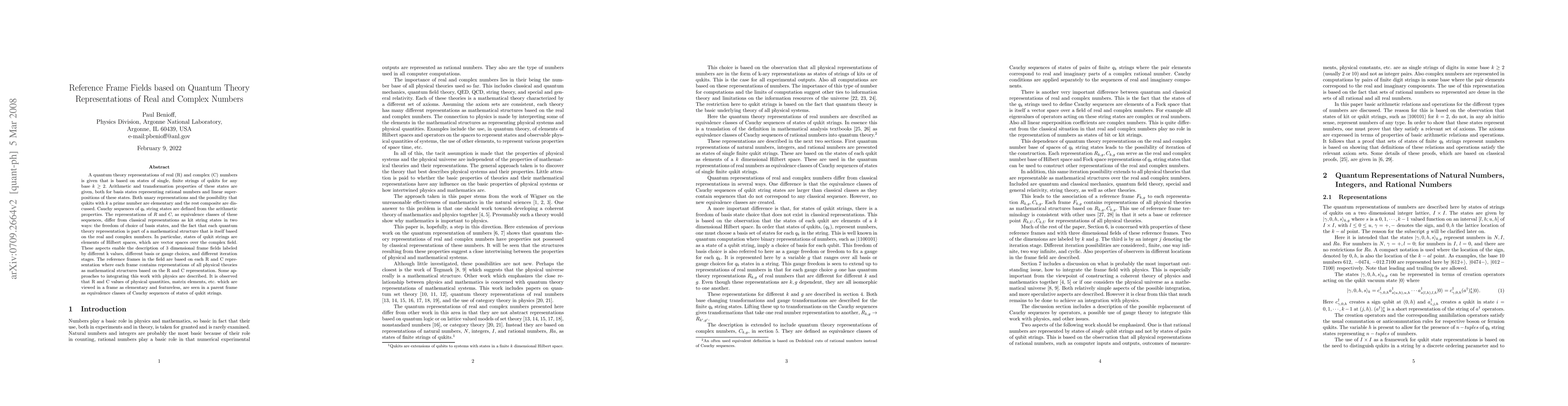A quantum theory representations of real (R) and complex (C) numbers is given that is based on states of single, finite strings of qukits for any base k > 1. Both unary representations and the possibility that qukits with k a prime number are elementary and the rest composite are discussed. Cauchy sequences of qukit string states are defined from the arithmetic properties. The representations of R and C, as equivalence classes of these sequences, differ from classical kit string state representations in two ways: the freedom of choice of basis states, and the fact that each quantum theory representation is part of a mathematical structure that is itself based on the real and complex numbers. These aspects enable the description of 3 dimensional frame fields labeled by different k values, different basis or gauge choices, and different iteration stages. The reference frames in the field are based on each R and C representation where each frame contains representations of all physical theories as mathematical structures based on the R and C representation. Approaches to integrating this with physics are described. It is observed that R and C values of physical quantities, matrix elements, etc. which are viewed in a frame as elementary and featureless, are seen in a parent frame as equivalence classes of Cauchy sequences of qukit string states.