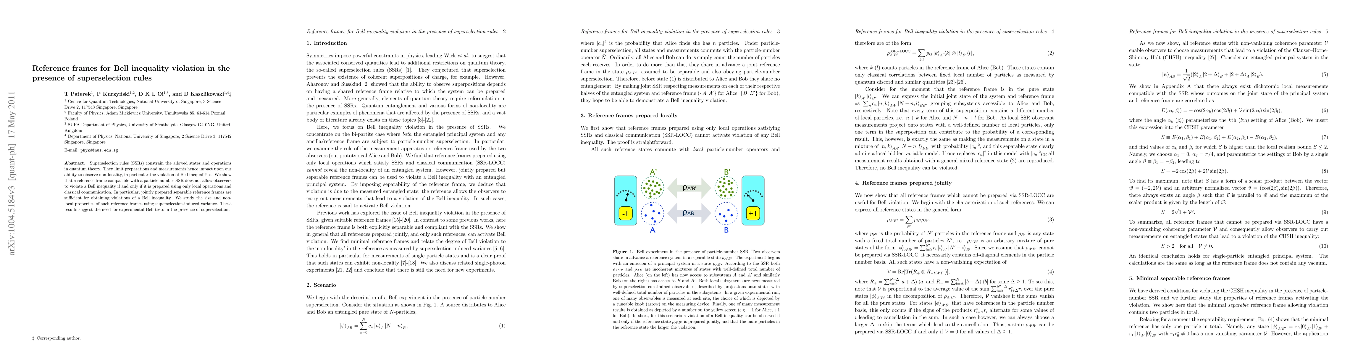 This paper explores how superselection rules affect the violation of Bell inequalities, demonstrating that reference frames compatible with particle number superselection rules cannot violate Bell inequalities unless prepared via local operations and classical communication. It concludes that jointly prepared separable reference frames can achieve such violations, highlighting the importance of experimental Bell tests in superselection contexts.