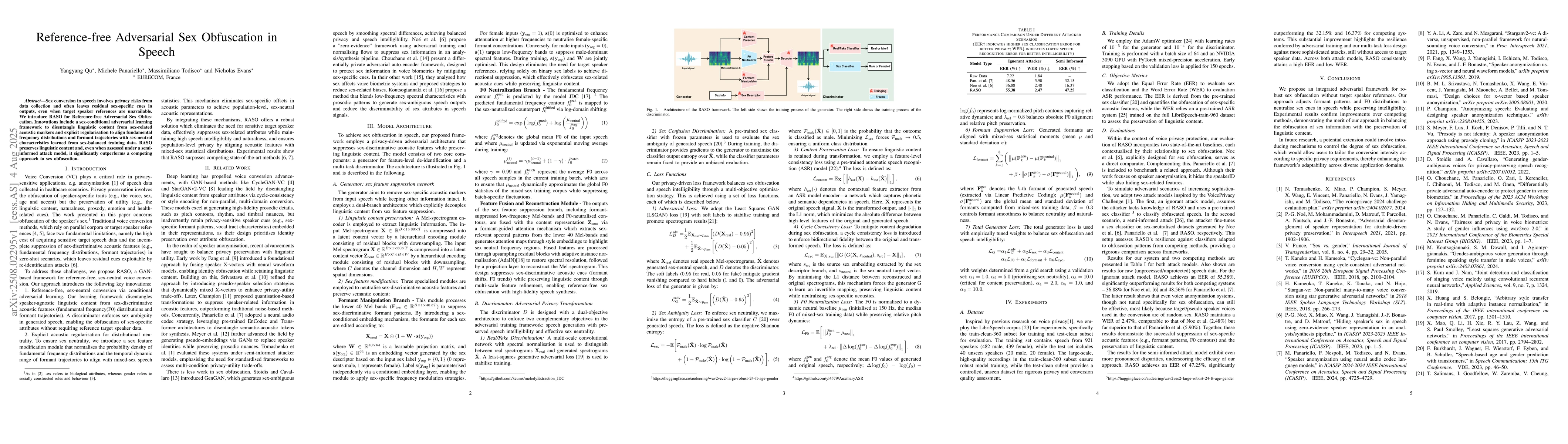 Sex conversion in speech involves privacy risks from data collection and often leaves residual sex-specific cues in outputs, even when target speaker references are unavailable. We introduce RASO for Reference-free Adversarial Sex Obfuscation. Innovations include a sex-conditional adversarial learning framework to disentangle linguistic content from sex-related acoustic markers and explicit regularisation to align fundamental frequency distributions and formant trajectories with sex-neutral characteristics learned from sex-balanced training data. RASO preserves linguistic content and, even when assessed under a semi-informed attack model, it significantly outperforms a competing approach to sex obfuscation.