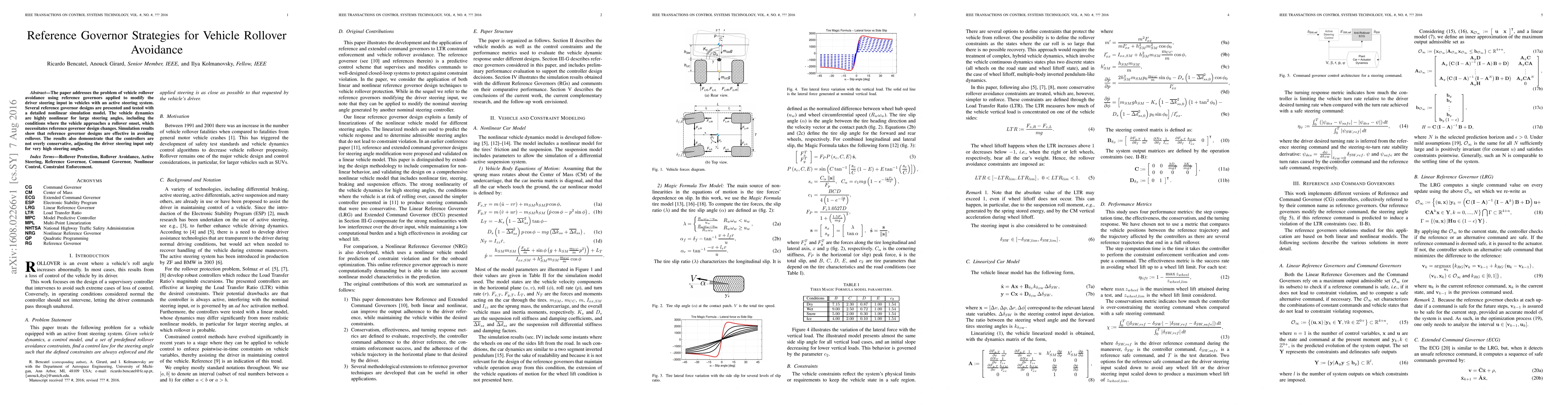 The paper addresses the problem of vehicle rollover avoidance using reference governors applied to modify the driver steering input in vehicles with an active steering system. Several reference governor designs are presented and tested with a detailed nonlinear simulation model. The vehicle dynamics are highly nonlinear for large steering angles, including the conditions where the vehicle approaches a rollover onset, which necessitates reference governor design changes. Simulation results show that reference governor designs are effective in avoiding rollover. The results also demonstrate that the controllers are not overly conservative, adjusting the driver steering input only for very high steering angles.