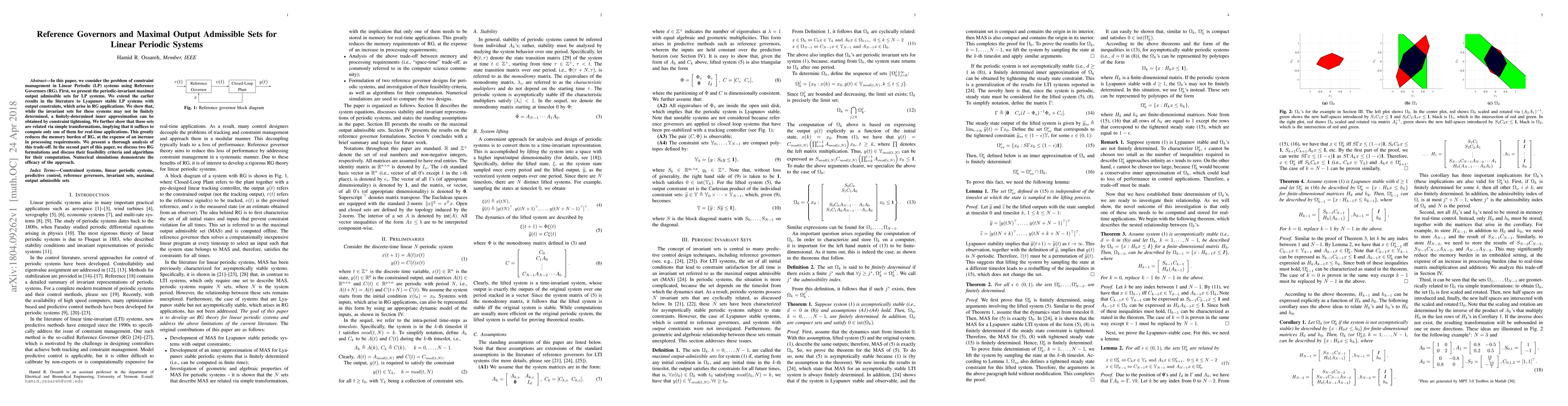 In this paper, we consider the problem of constraint management in Linear Periodic (LP) systems using Reference Governors (RG). First, we present the periodic-invariant maximal output admissible sets for LP systems. We extend the earlier results in the literature to Lyapunov stable LP systems with output constraints, which arise in RG applications. We show that, while the invariant sets for these systems may not be finitely determined, a finitely-determined inner approximation can be obtained by constraint tightening. We further show that these sets are related via simple transformations, implying that it suffices to compute only one of them for real-time applications. This greatly reduces the memory burden of RG, at the expense of an increase in processing requirements. We present a thorough analysis of this trade-off. In the second part of this paper, we discuss two RG formulations and discuss their feasibility criteria and algorithms for their computation. Numerical simulations demonstrate the efficacy of the approach.