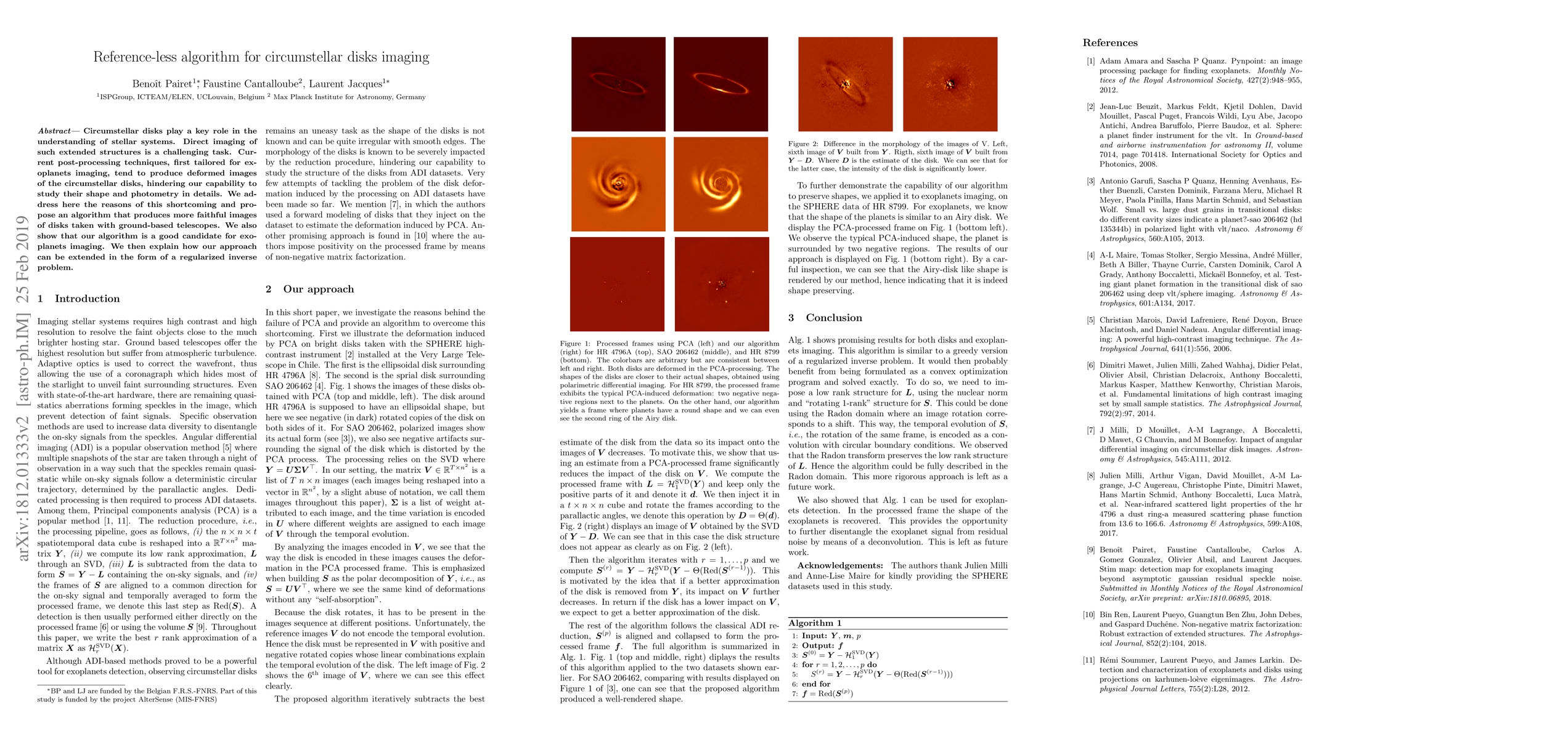 This paper presents a reference-less algorithm for accurately imaging circumstellar disks, addressing the deformation issues in current post-processing techniques. The proposed method produces more faithful disk images, suitable for both circumstellar disks and exoplanets, and can be extended as a regularized inverse problem.