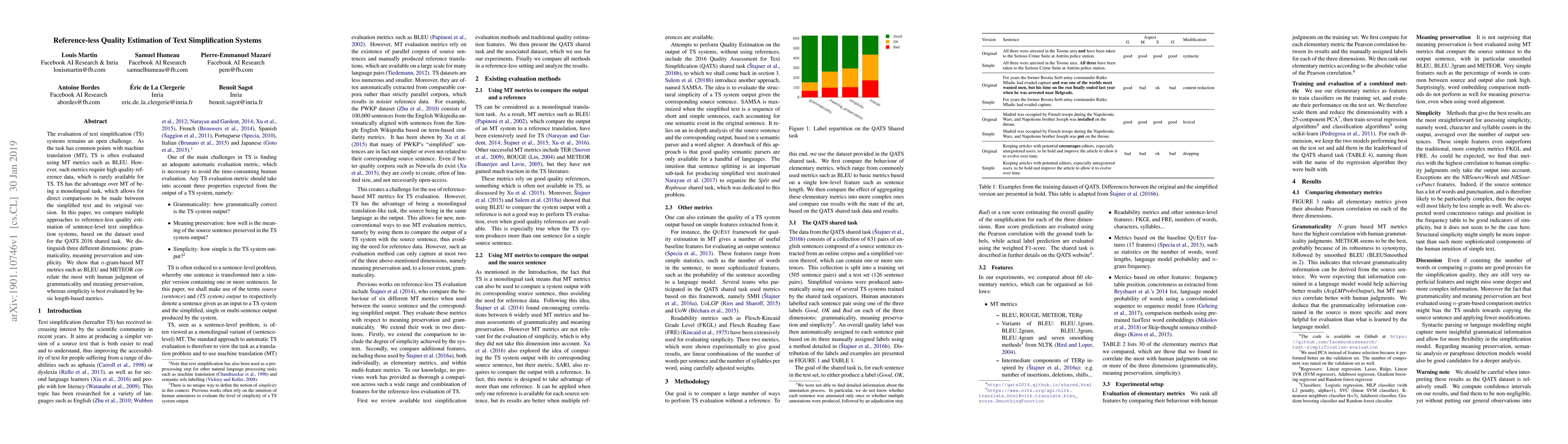 The evaluation of text simplification (TS) systems remains an open challenge. As the task has common points with machine translation (MT), TS is often evaluated using MT metrics such as BLEU. However, such metrics require high quality reference data, which is rarely available for TS. TS has the advantage over MT of being a monolingual task, which allows for direct comparisons to be made between the simplified text and its original version. In this paper, we compare multiple approaches to reference-less quality estimation of sentence-level text simplification systems, based on the dataset used for the QATS 2016 shared task. We distinguish three different dimensions: gram-maticality, meaning preservation and simplicity. We show that n-gram-based MT metrics such as BLEU and METEOR correlate the most with human judgment of grammaticality and meaning preservation, whereas simplicity is best evaluated by basic length-based metrics.