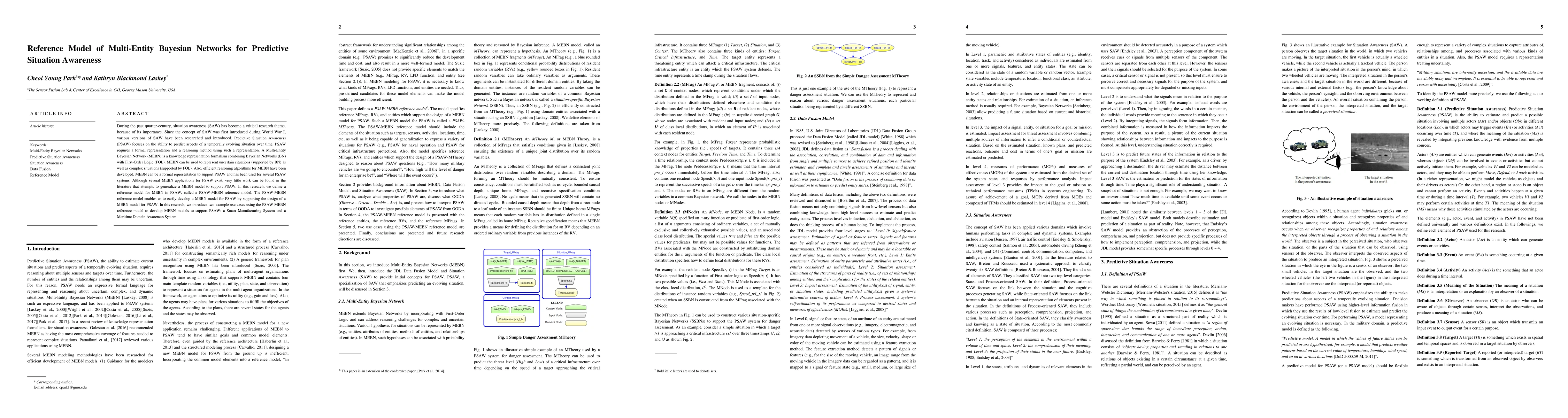 During the past quarter-century, situation awareness (SAW) has become a critical research theme, because of its importance. Since the concept of SAW was first introduced during World War I, various versions of SAW have been researched and introduced. Predictive Situation Awareness (PSAW) focuses on the ability to predict aspects of a temporally evolving situation over time. PSAW requires a formal representation and a reasoning method using such a representation. A Multi-Entity Bayesian Network (MEBN) is a knowledge representation formalism combining Bayesian Networks (BN) with First-Order Logic (FOL). MEBN can be used to represent uncertain situations (supported by BN) as well as complex situations (supported by FOL). Also, efficient reasoning algorithms for MEBN have been developed. MEBN can be a formal representation to support PSAW and has been used for several PSAW systems. Although several MEBN applications for PSAW exist, very little work can be found in the literature that attempts to generalize a MEBN model to support PSAW. In this research, we define a reference model for MEBN in PSAW, called a PSAW-MEBN reference model. The PSAW-MEBN reference model enables us to easily develop a MEBN model for PSAW by supporting the design of a MEBN model for PSAW. In this research, we introduce two example use cases using the PSAW-MEBN reference model to develop MEBN models to support PSAW: a Smart Manufacturing System and a Maritime Domain Awareness System.