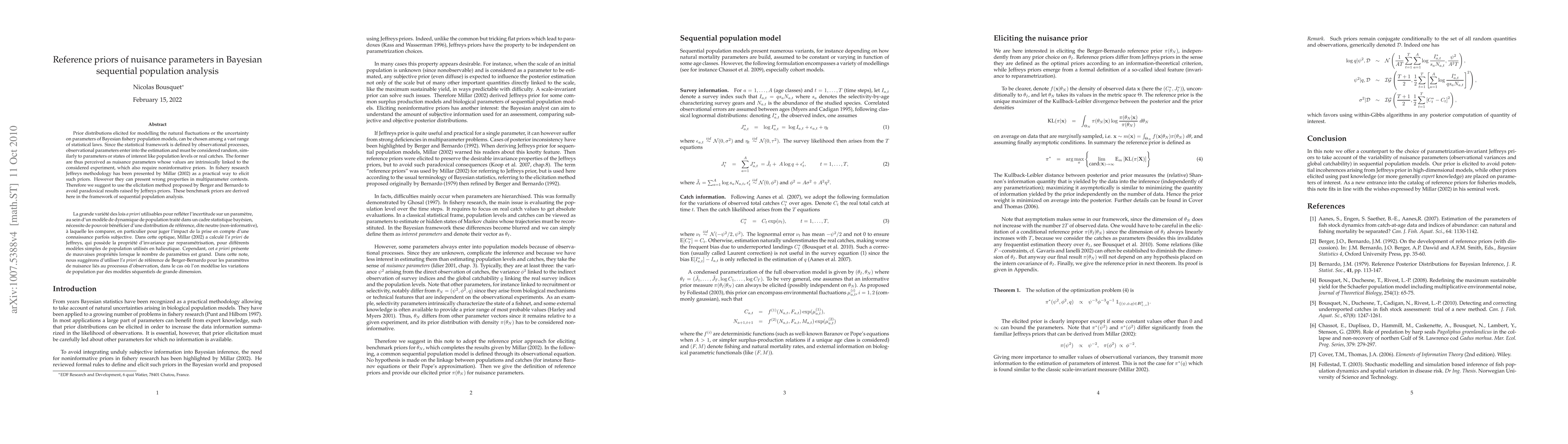 This paper discusses the use of reference priors for nuisance parameters in Bayesian sequential population analysis, particularly in fishery models. It critiques Jeffreys' methodology for eliciting noninformative priors and suggests using the Berger and Bernardo method to avoid paradoxical results, providing benchmark priors in the context of sequential population analysis.