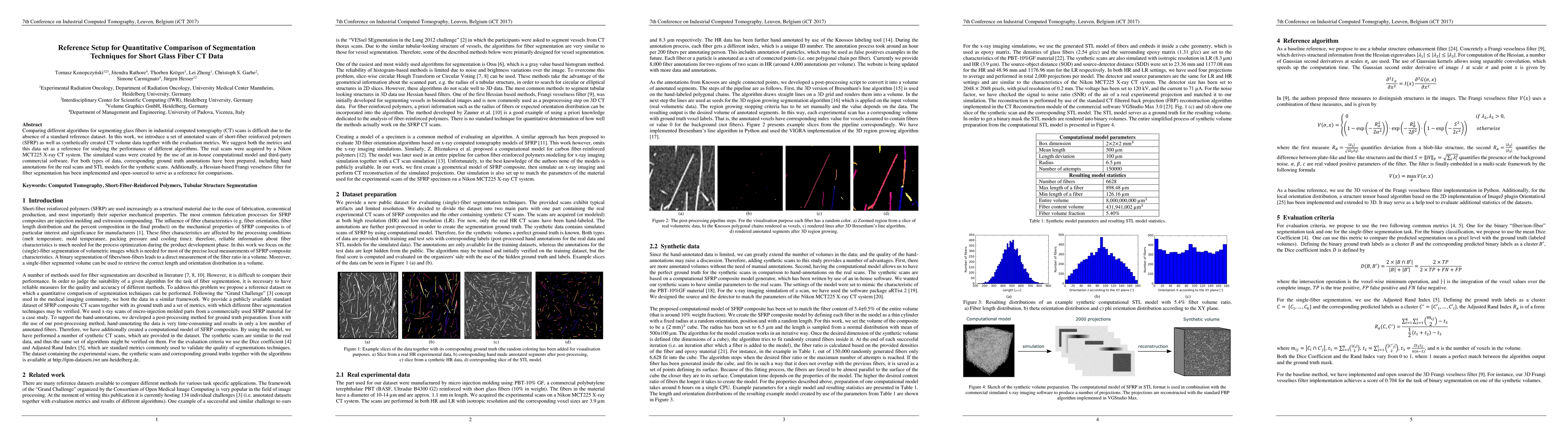 Comparing different algorithms for segmenting glass fibers in industrial computed tomography (CT) scans is difficult due to the absence of a standard reference dataset. In this work, we introduce a set of annotated scans of short-fiber reinforced polymers (SFRP) as well as synthetically created CT volume data together with the evaluation metrics. We suggest both the metrics and this data set as a reference for studying the performance of different algorithms. The real scans were acquired by a Nikon MCT225 X-ray CT system. The simulated scans were created by the use of an in-house computational model and third-party commercial software. For both types of data, corresponding ground truth annotations have been prepared, including hand annotations for the real scans and STL models for the synthetic scans. Additionally, a Hessian-based Frangi vesselness filter for fiber segmentation has been implemented and open-sourced to serve as a reference for comparisons.