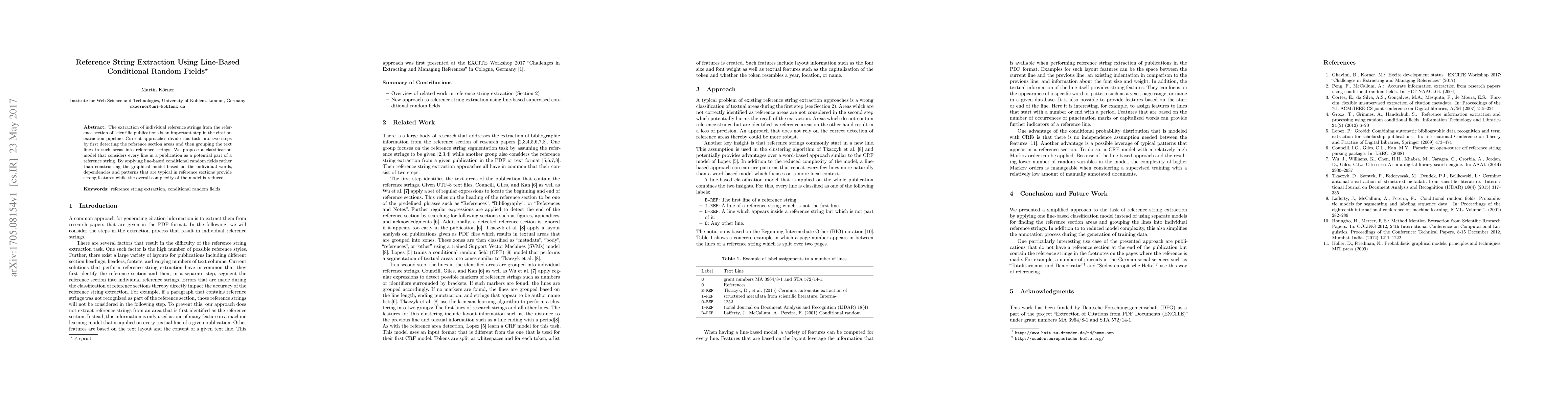 This paper proposes a line-based conditional random fields model for extracting reference strings from scientific publications, directly classifying each line as part of a reference string. This approach reduces model complexity while leveraging dependencies and patterns typical in reference sections.