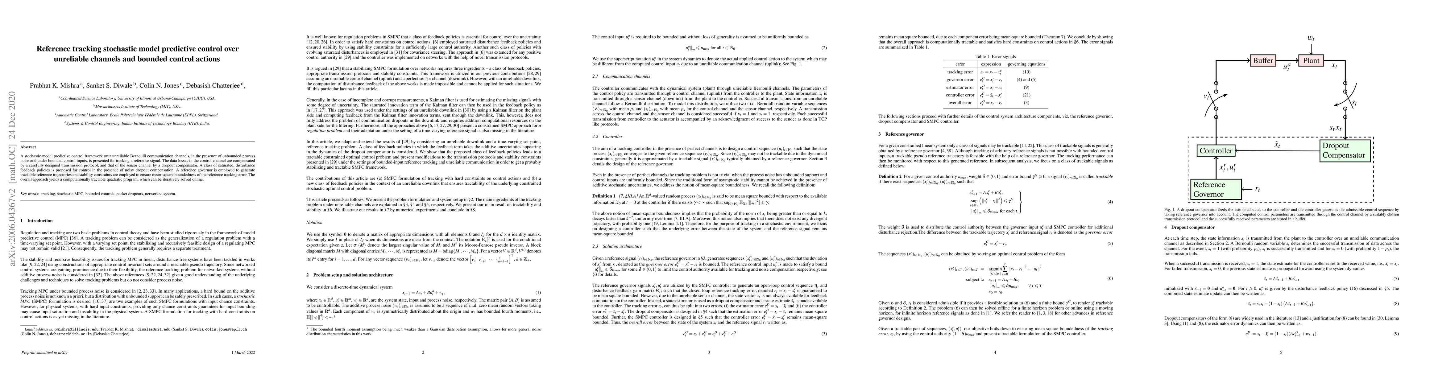This paper proposes a stochastic model predictive control framework for tracking a reference signal over unreliable communication channels, addressing data losses through a transmission protocol and a dropout compensator. It employs a reference governor and stability constraints to ensure mean-square boundedness of the tracking error, resulting in a computationally tractable quadratic program.