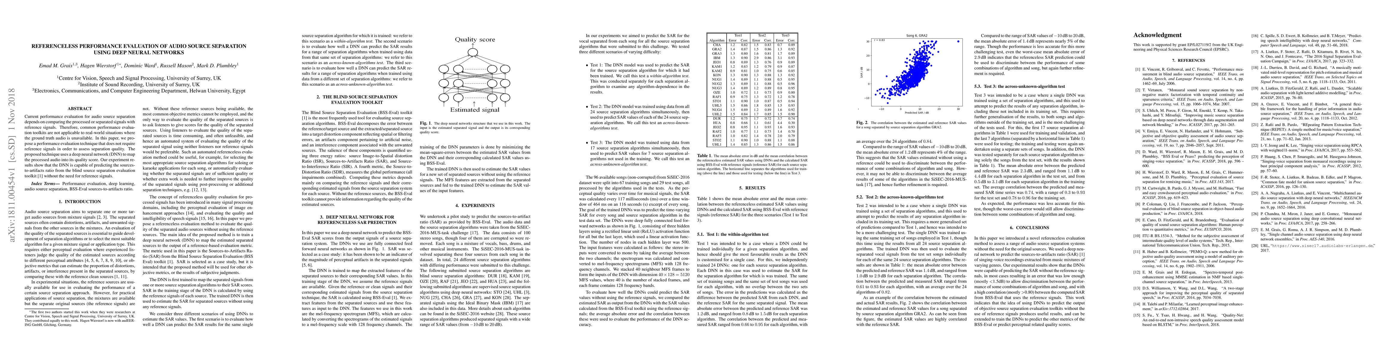 This paper proposes a referenceless performance evaluation method for audio source separation using deep neural networks, which assesses separation quality without requiring ground truth signals. The technique employs a DNN to map processed audio to a quality score, demonstrating its effectiveness in predicting separation quality.