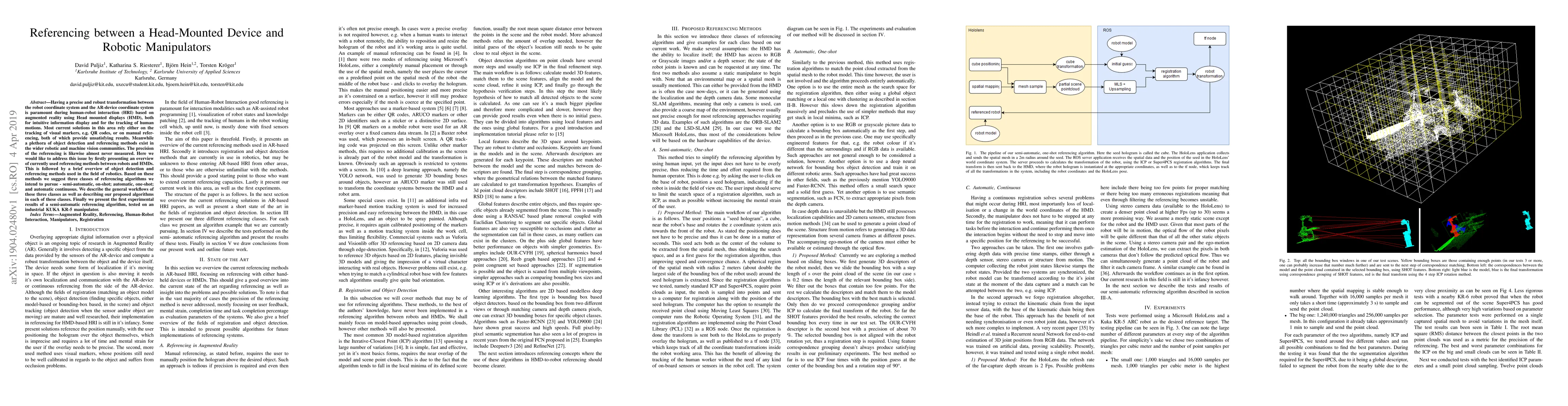 Having a precise and robust transformation between the robot coordinate system and the AR-device coordinate system is paramount during human-robot interaction (HRI) based on augmented reality using Head mounted displays (HMD), both for intuitive information display and for the tracking of human motions. Most current solutions in this area rely either on the tracking of visual markers, e.g. QR codes, or on manual referencing, both of which provide unsatisfying results. Meanwhile a plethora of object detection and referencing methods exist in the wider robotic and machine vision communities. The precision of the referencing is likewise almost never measured. Here we would like to address this issue by firstly presenting an overview of currently used referencing methods between robots and HMDs. This is followed by a brief overview of object detection and referencing methods used in the field of robotics. Based on these methods we suggest three classes of referencing algorithms we intend to pursue - semi-automatic, on-shot; automatic, one-shot; and automatic continuous. We describe the general workflows of these three classes as well as describing our proposed algorithms in each of these classes. Finally we present the first experimental results of a semi-automatic referencing algorithm, tested on an industrial KUKA KR-5 manipulator.
