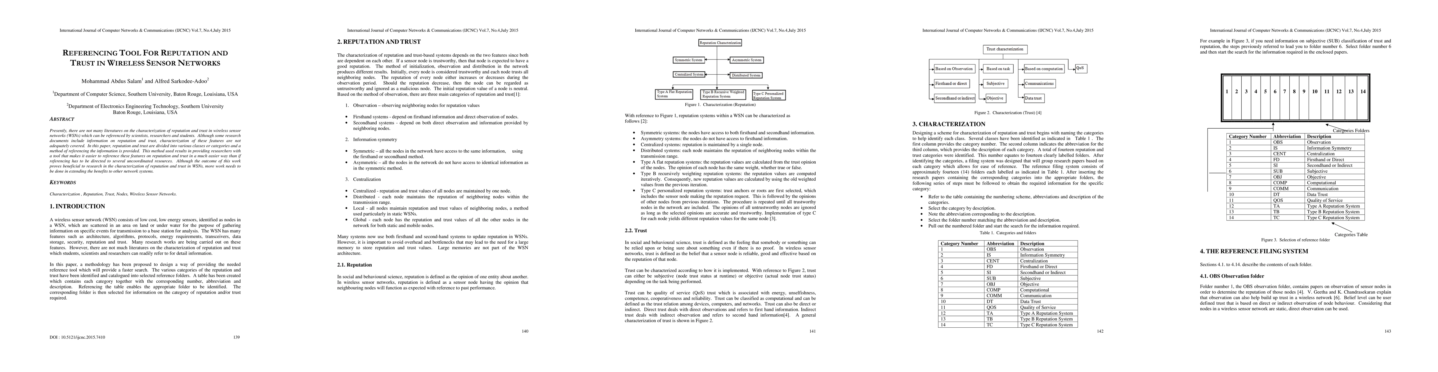 This paper develops a referencing tool to categorize and simplify the characterization of reputation and trust in wireless sensor networks (WSNs). It aims to provide researchers with an organized method to reference these features, enhancing the ease of access compared to scattered resources.